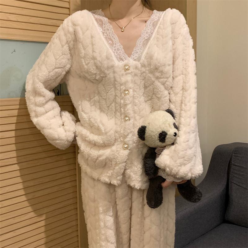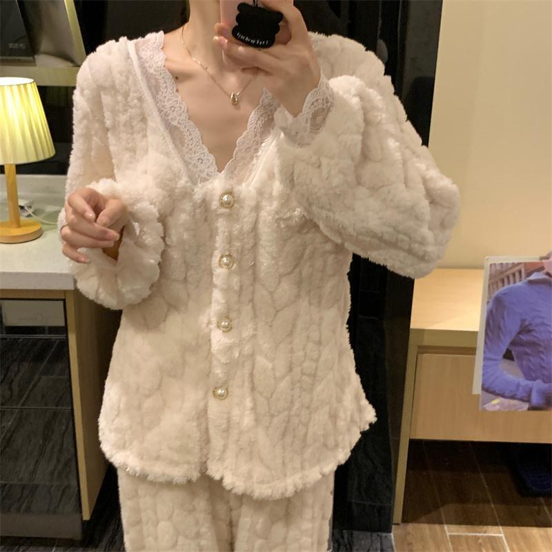 ルームウェア 新作 パジャマ冬 ルームウェア 可愛い レース パジャマ レディース フランネル 保温 ルームウェア セットアップ 韓国ファッション 部屋着
