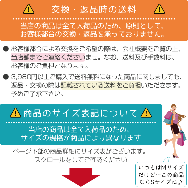 サイズ間違い・イメージ違いなど、お客様都合によるキャンセルやご交換は原則として承っておりません。返品ルールに関しましては、リンク先ページをご覧の上、お気軽にお問い合わせください。