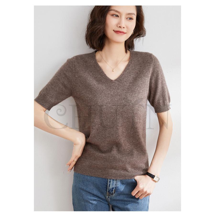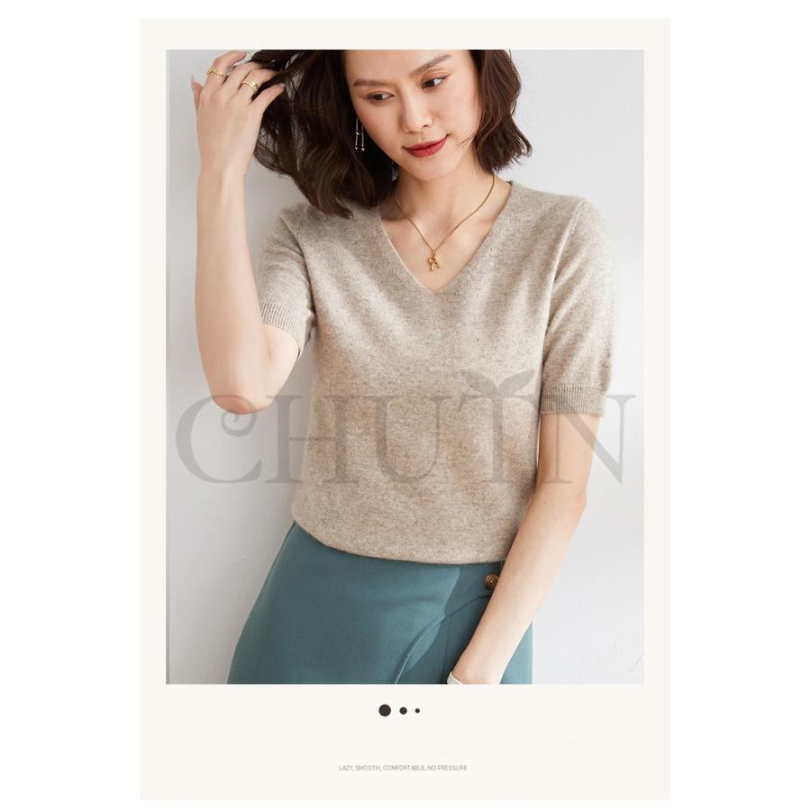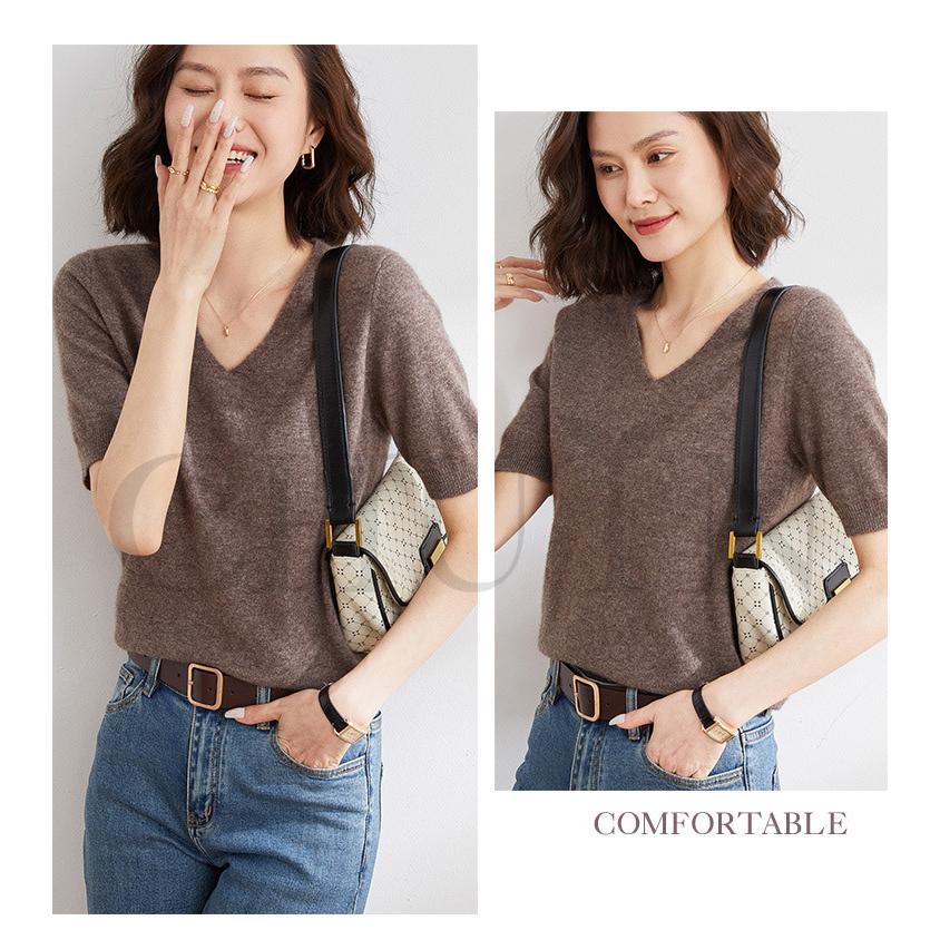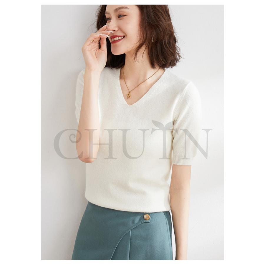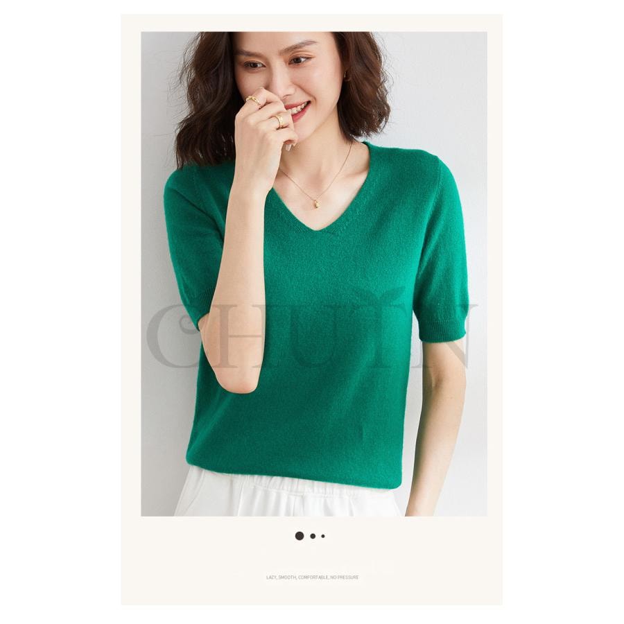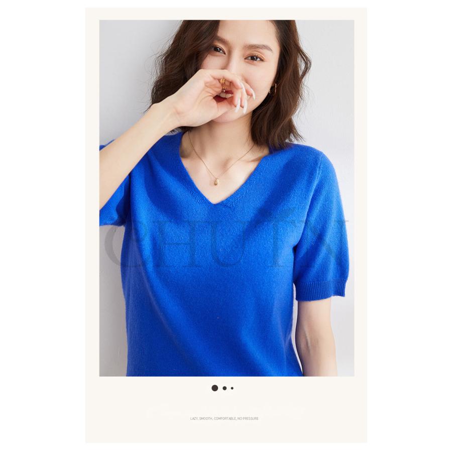 サマーニット セーター レディース vネック 五分袖ニットトップス プルオーバー ゆったり 着痩せtシャツ 韓国風通勤大人30代40代ロイヤルブルー夏秋