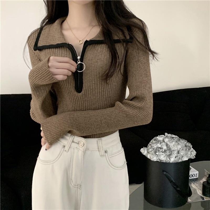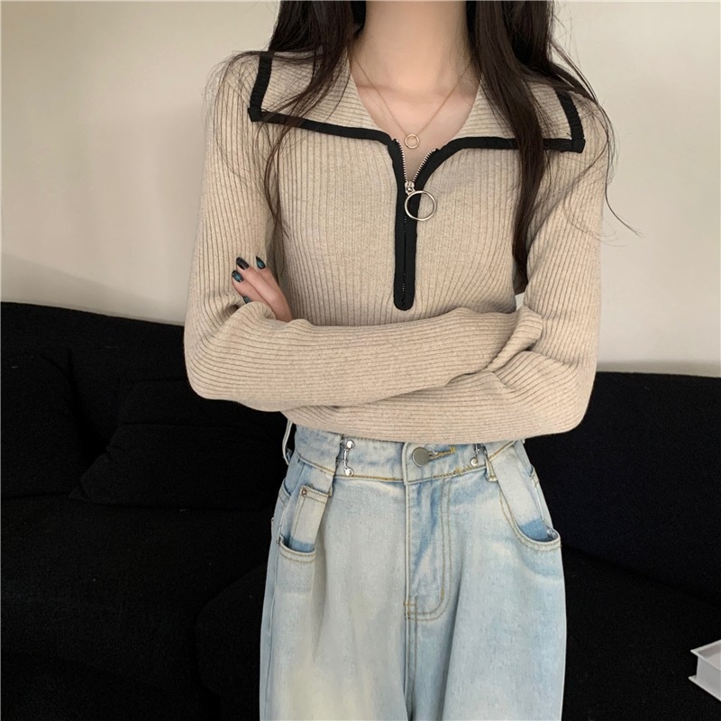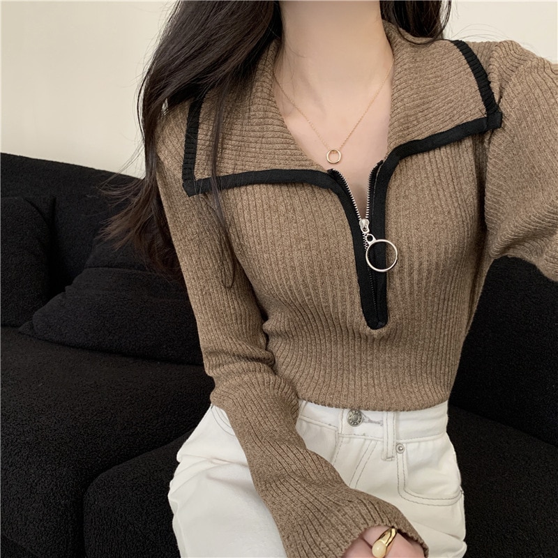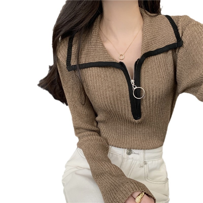 色の衝突ハーフジップラペルジャンパー女性春と秋の底スリム薄いニットセータートップス ニット セーター