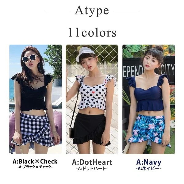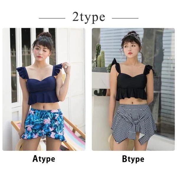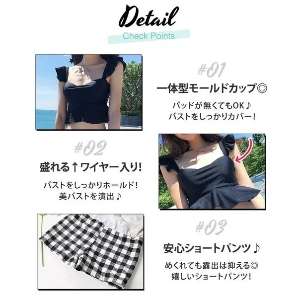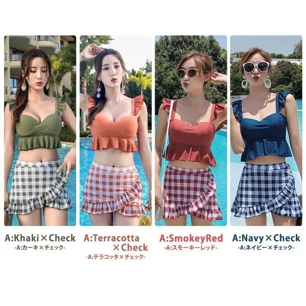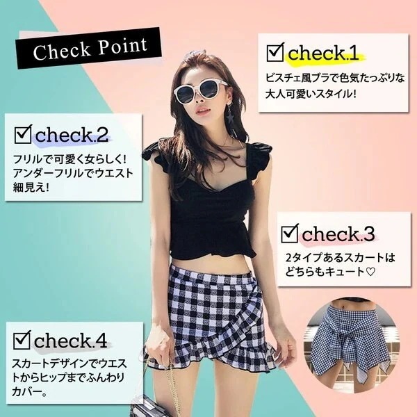 水着 レディース ビキニ ビスチェ風 ハイウエスト 2点セット 人気 ギンガムチェック柄 フレア フ ビキニ