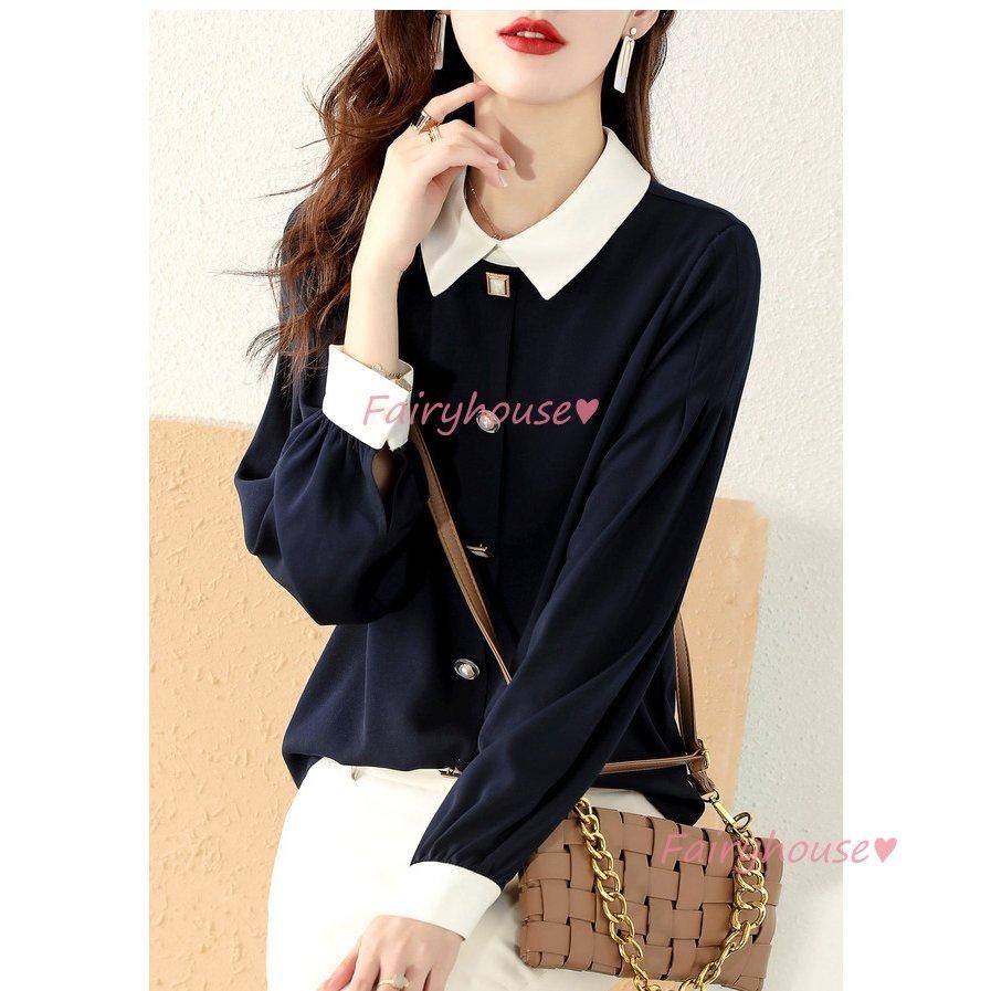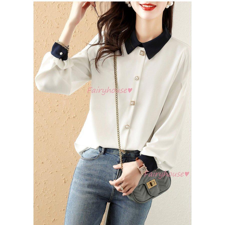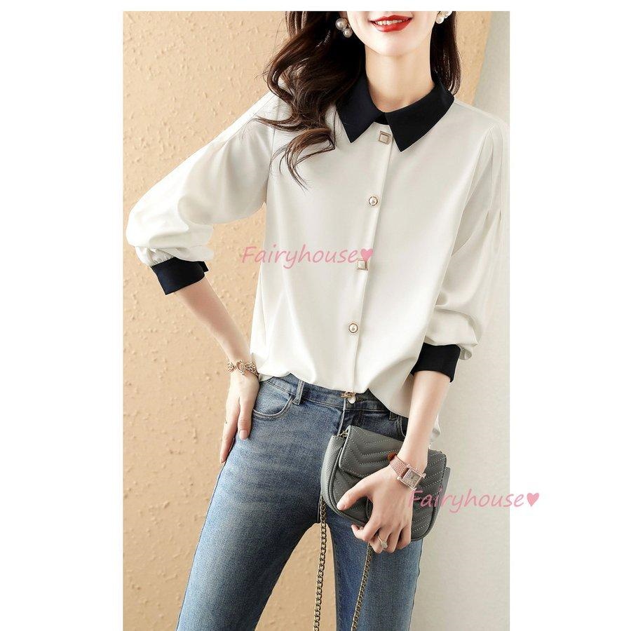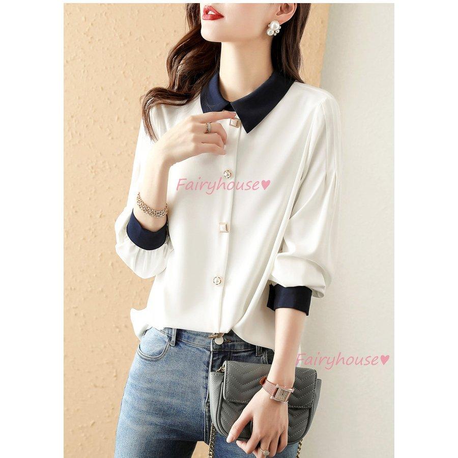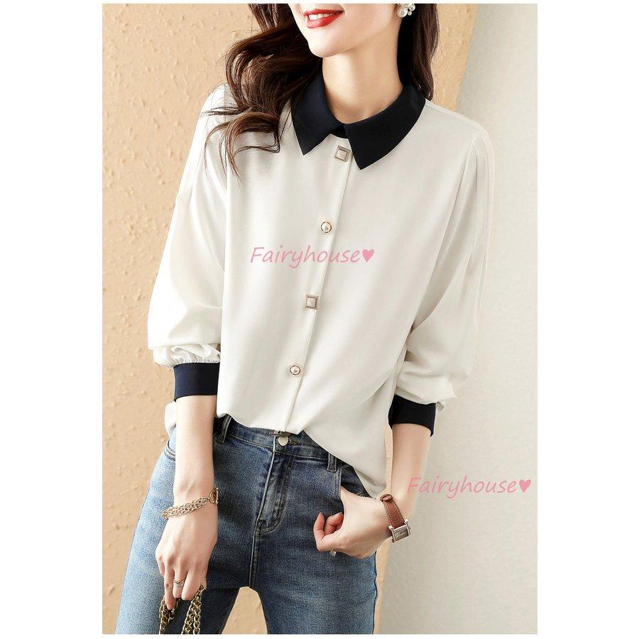 ブラウス レディース 長袖ブラウス 秋服 オフィスブラウス 白 配色 オシャレブラウス 折り襟トップス 韓国風 大人 通勤ゆったりシャツ 40代 30代 50代