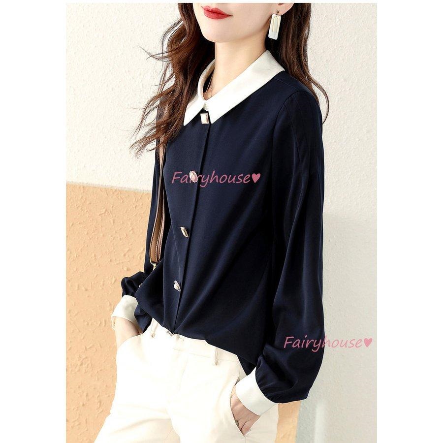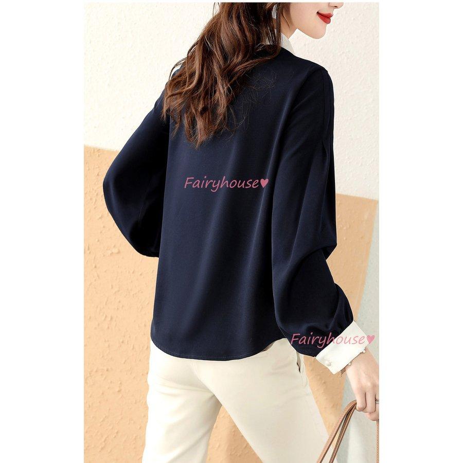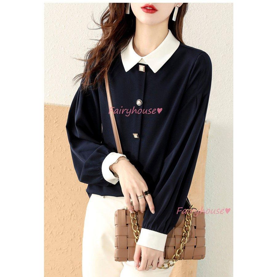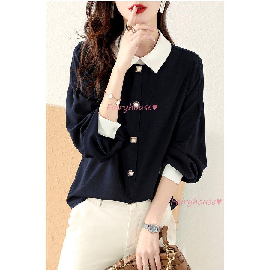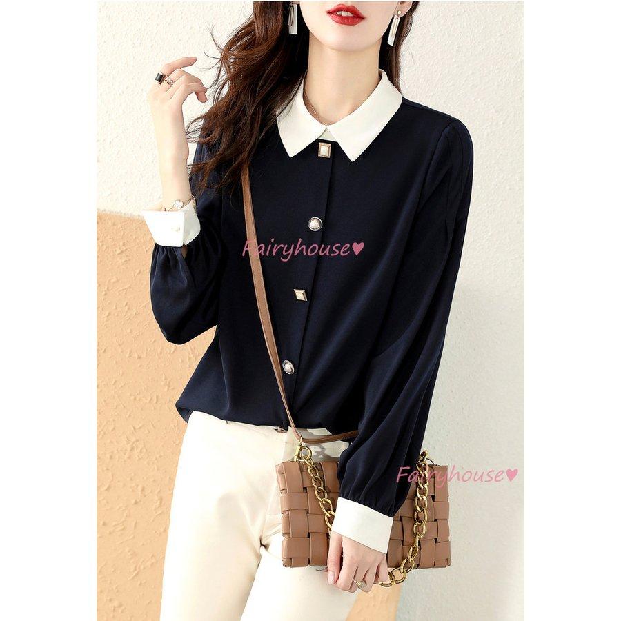 ブラウス レディース 長袖ブラウス 秋服 オフィスブラウス 白 配色 オシャレブラウス 折り襟トップス 韓国風 大人 通勤ゆったりシャツ 40代 30代 50代