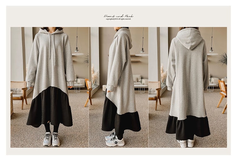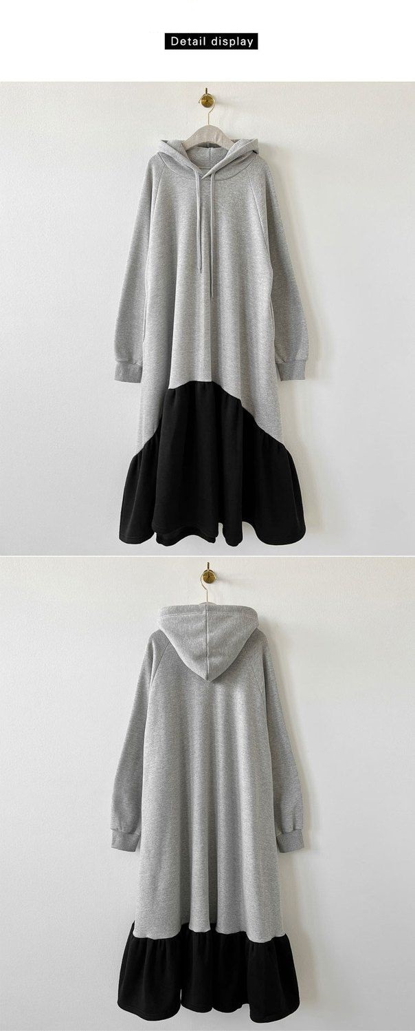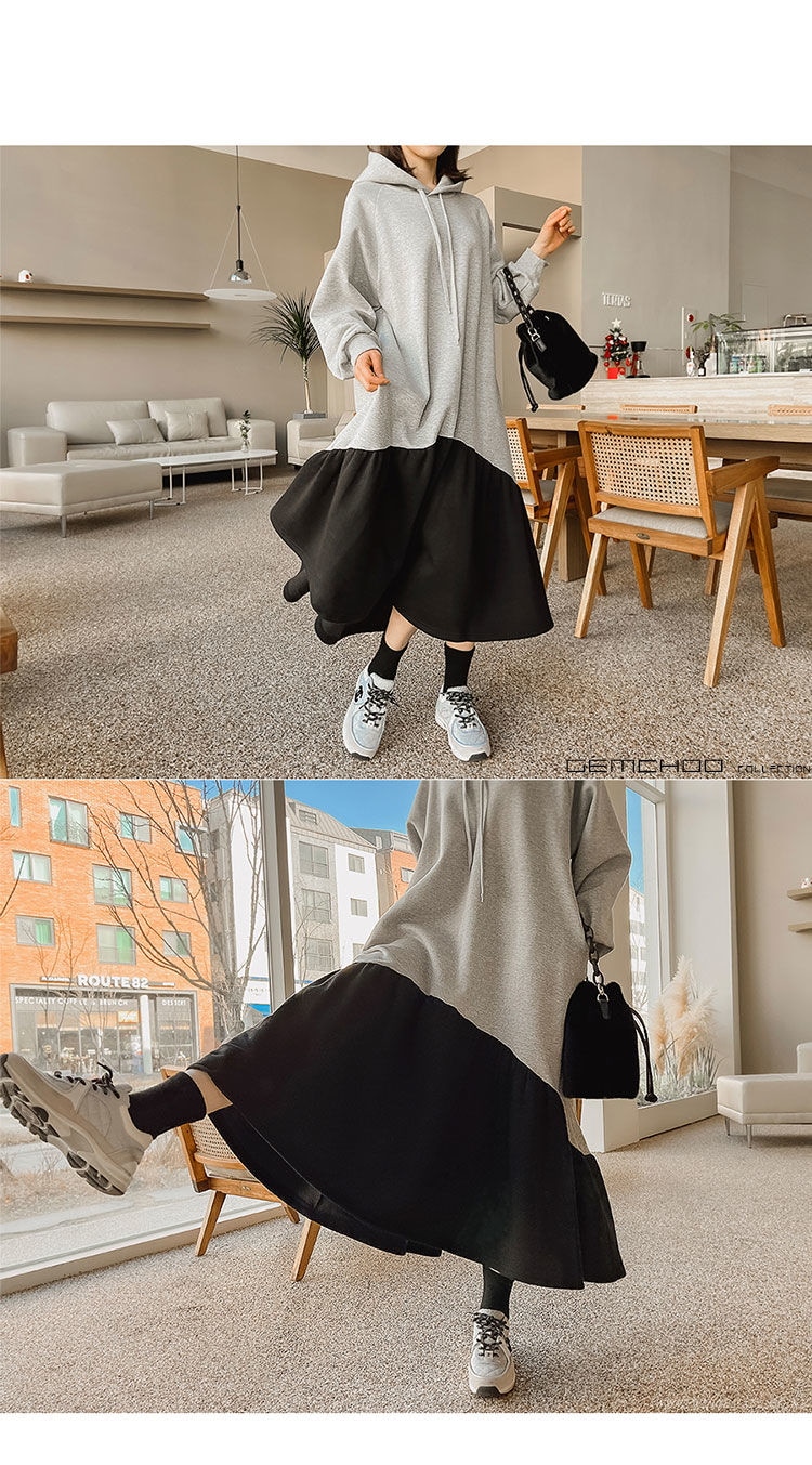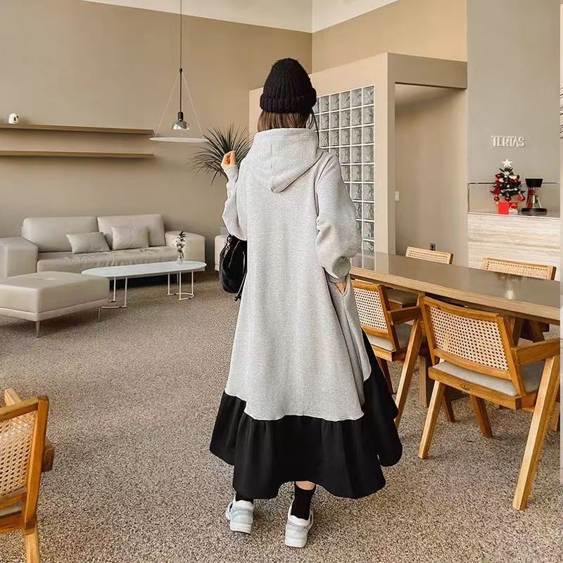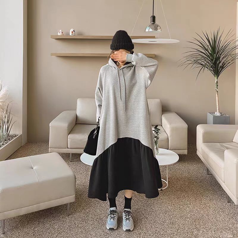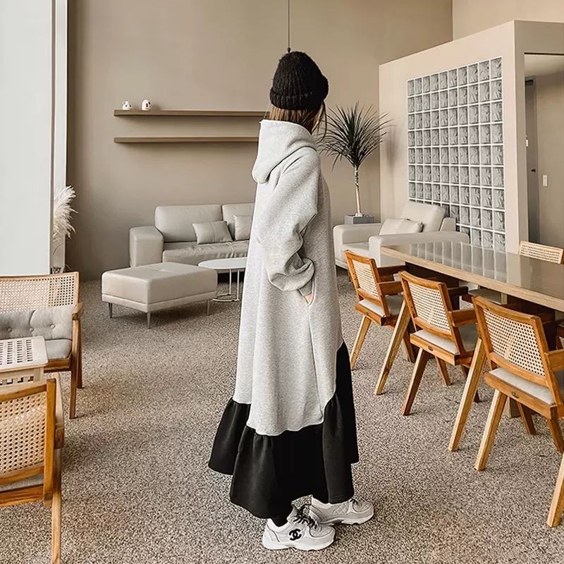 レデイース服ワンピースロング長袖マキシワンピース切り替えワンピース2024秋新品ゆったりフード付き切り替え秋冬厚着通勤通学L-4XL 袖なしロング マキシ丈ワンピ