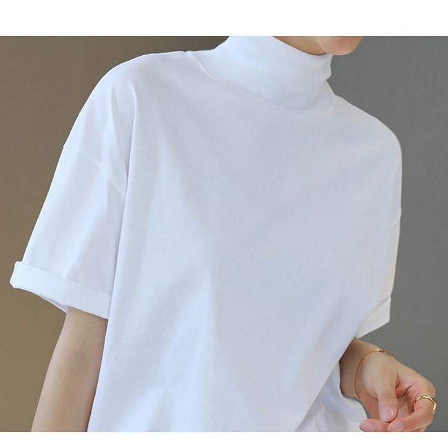 ハイネック Tシャツ しい レディース 春 夏 半袖トップス カットソー ストレッチ ボトルネック ゆったり 無地 uvカット サイド スリット おしゃれ 綿 夏服