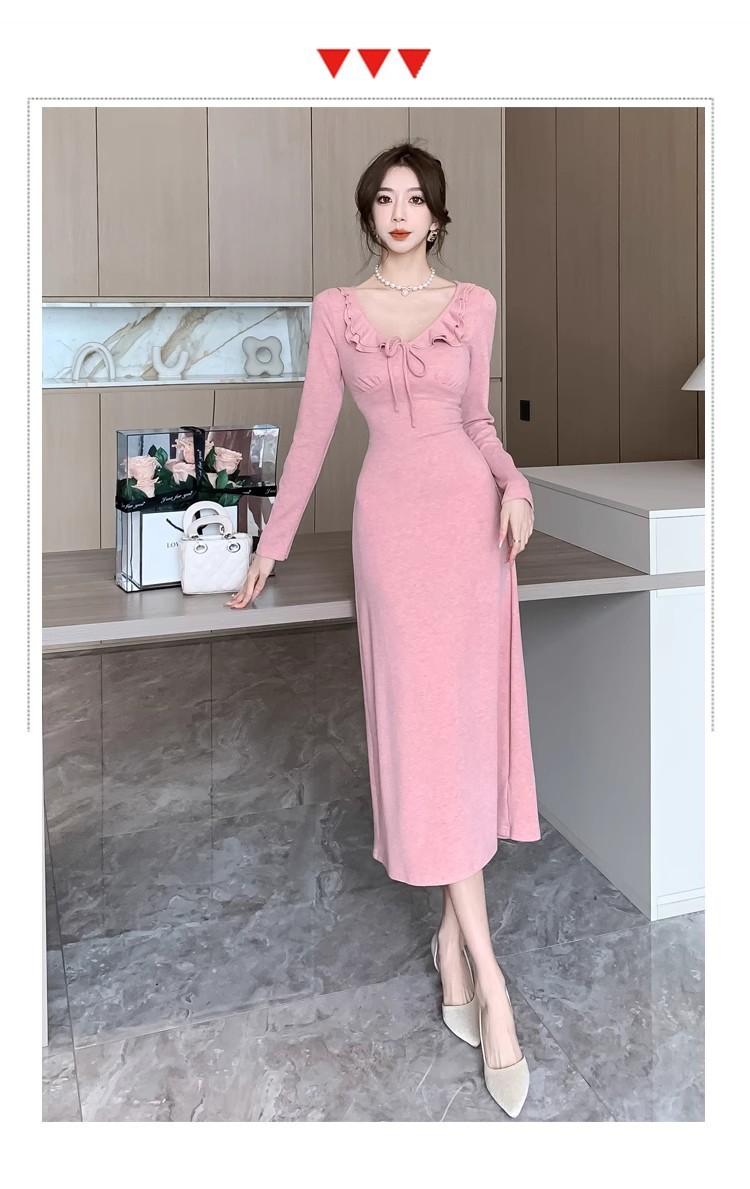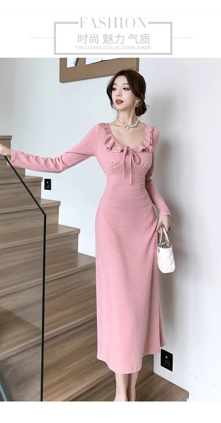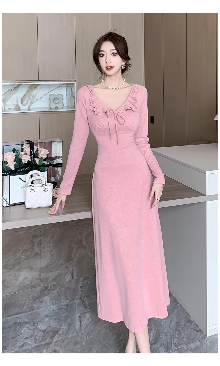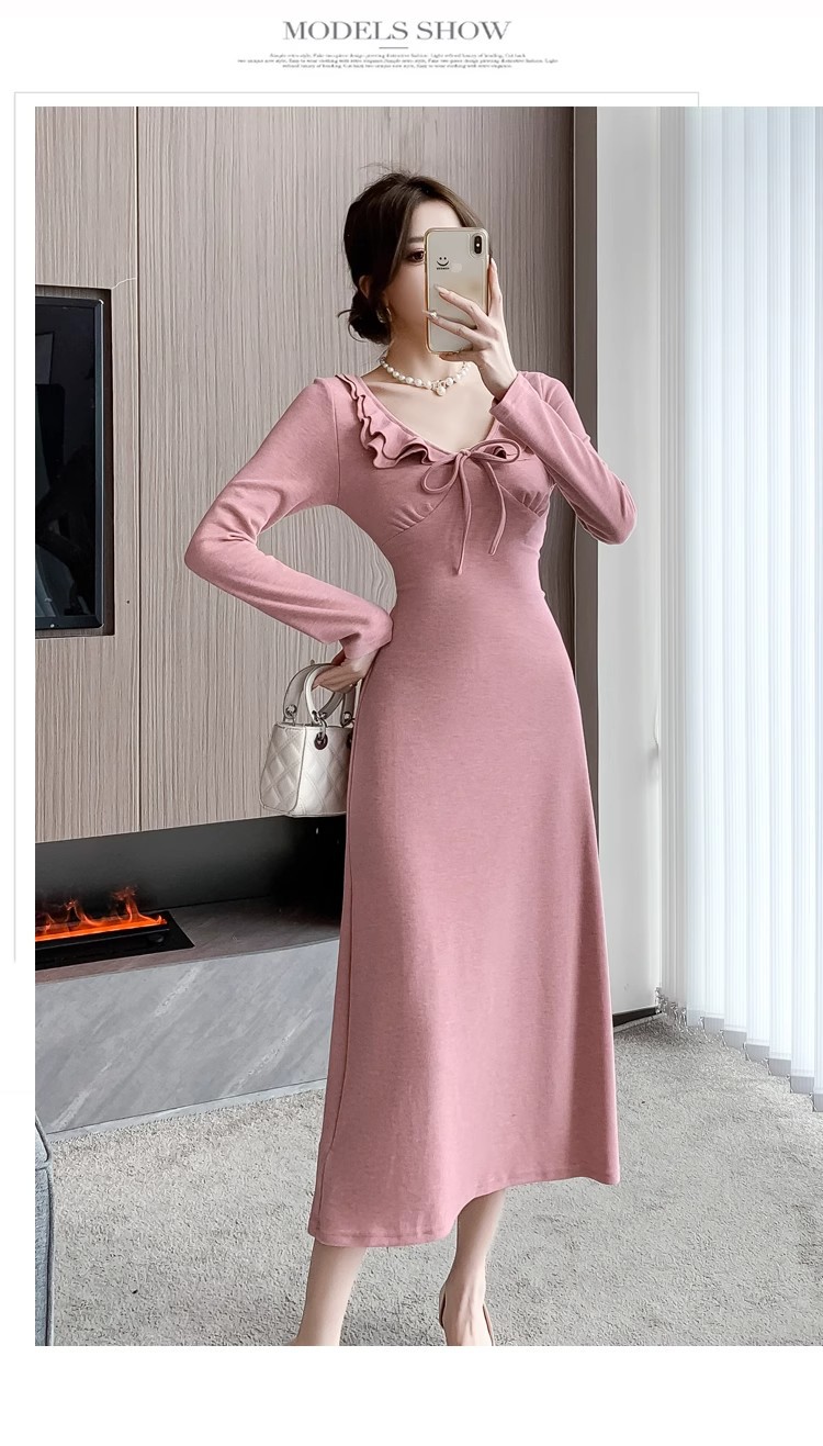 軽やかで大人っぽい優しげな長袖ピンクニットワンピース女秋冬フリルバインダー気品セレブフィットロングスカート 長袖ロング マキシ丈ワンピ