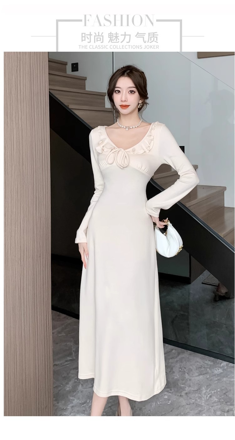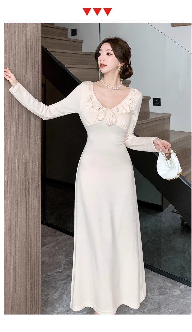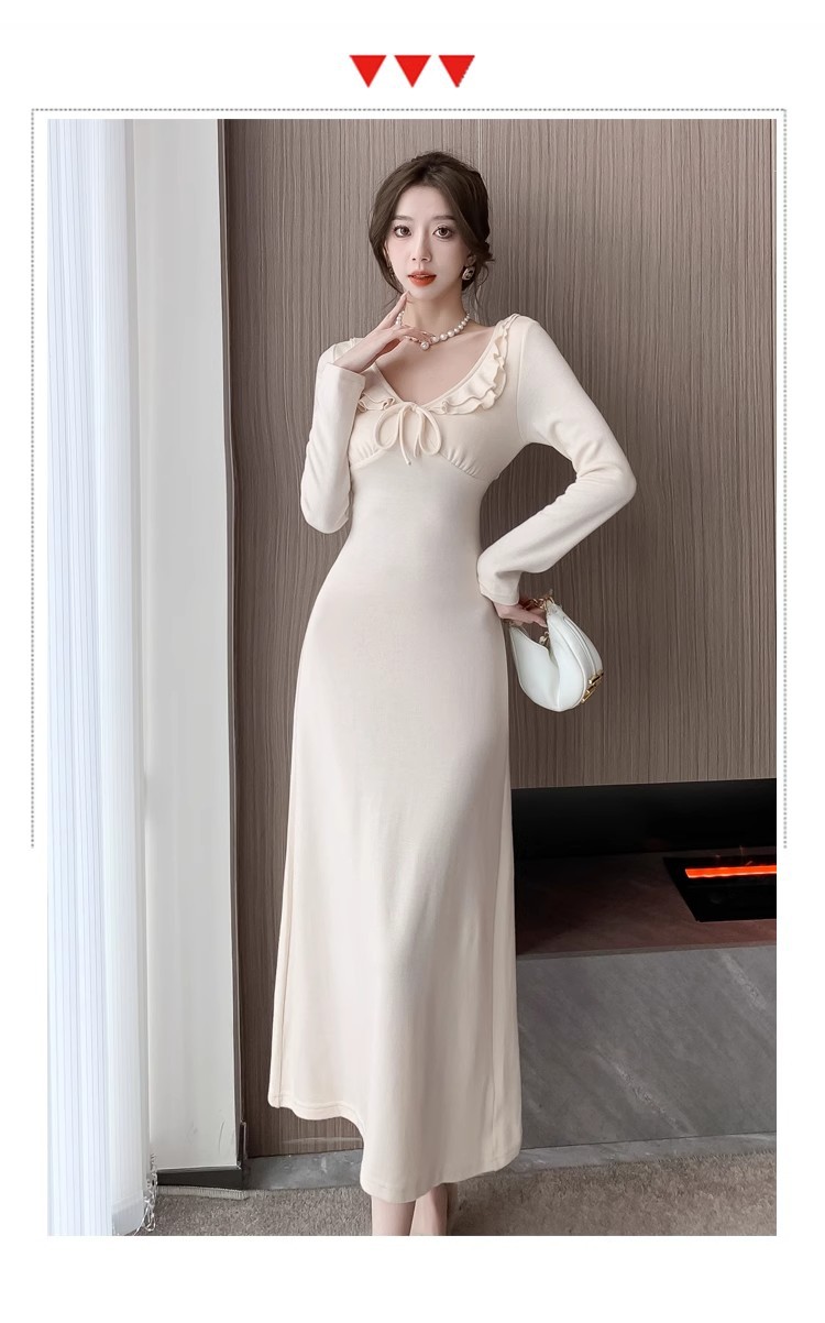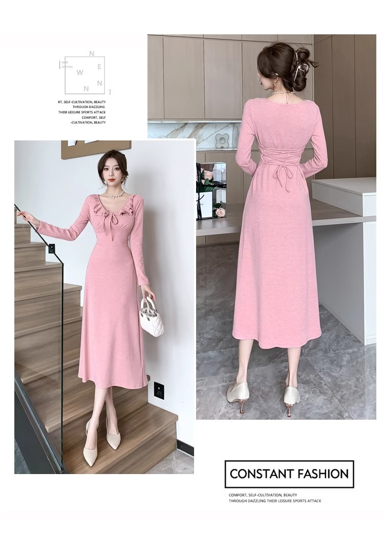 軽やかで大人っぽい優しげな長袖ピンクニットワンピース女秋冬フリルバインダー気品セレブフィットロングスカート 長袖ロング マキシ丈ワンピ