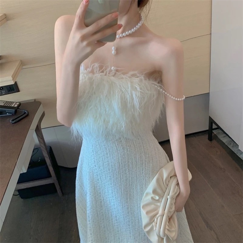 気品セレブは腰を収め胸を拭く一文字肩の白いワンピース女性秋冬のインナーに真珠のサスペンダーの中のロングスカートを 長袖ロング マキシ丈ワンピ
