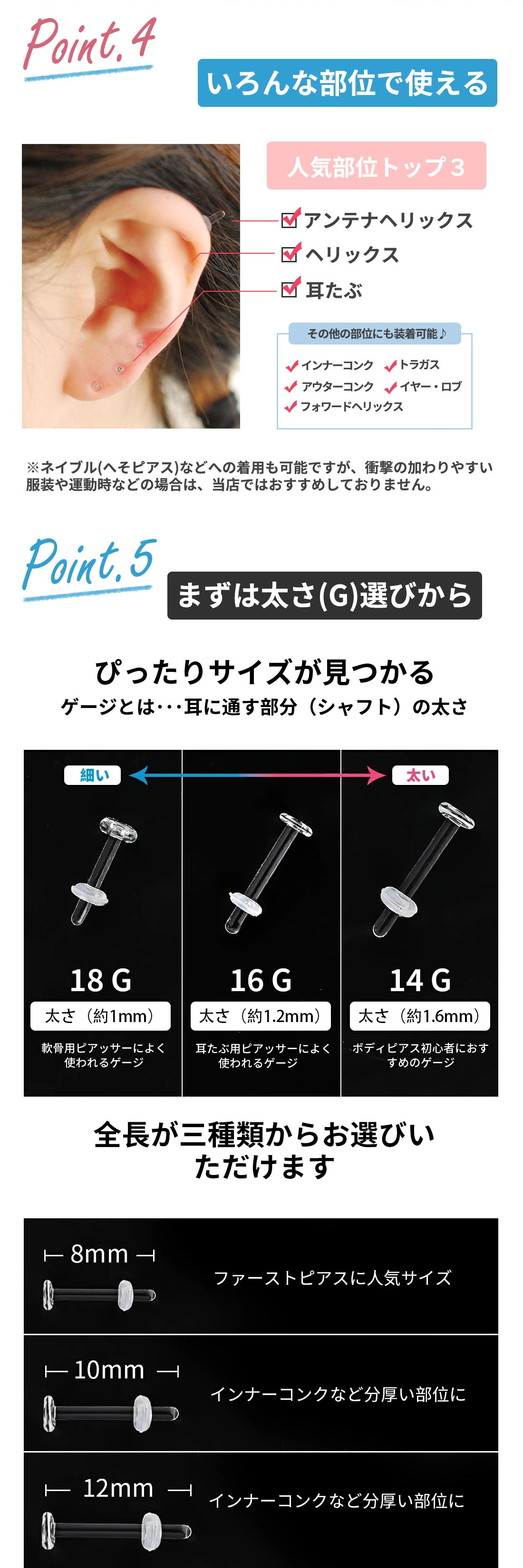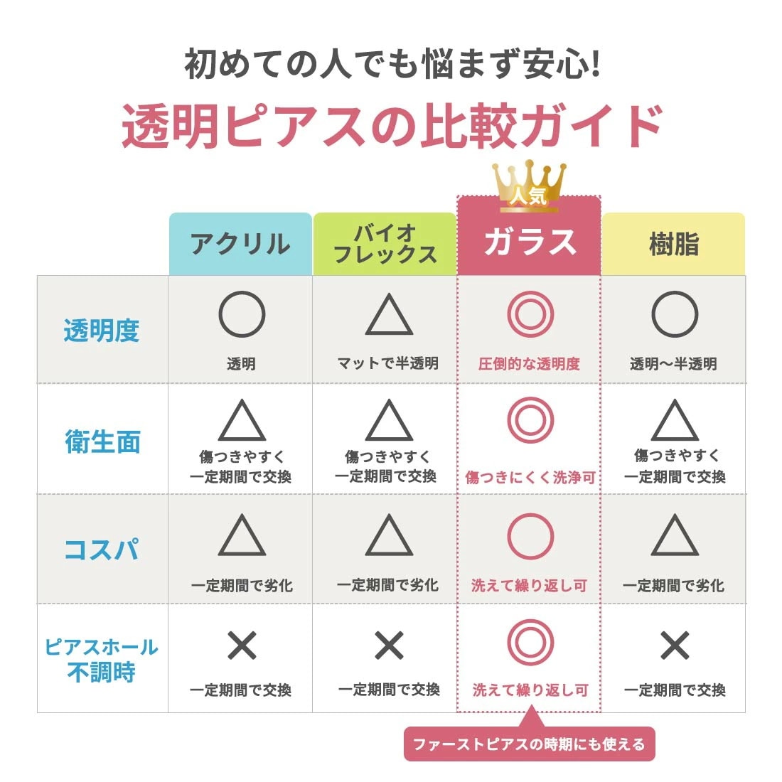 透明ピアス 18G 16G 14G 強化ガラス 片耳用 素材 リテーナー つけっぱなし ピアス 透明 クリア 耳たぶ ボディピアス 軟骨ピアス へそピアス 金属アレルギー対応 ガラスピアス
