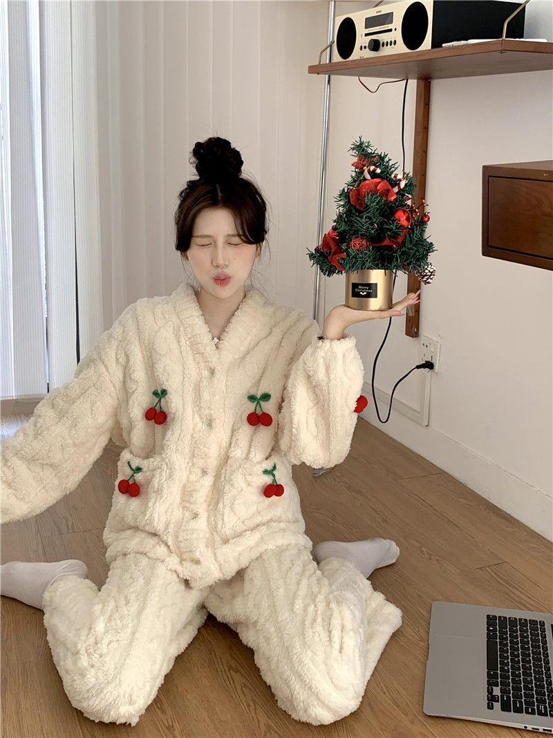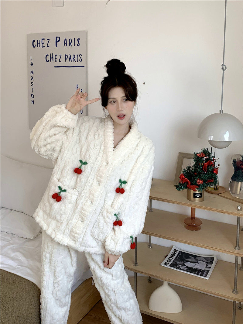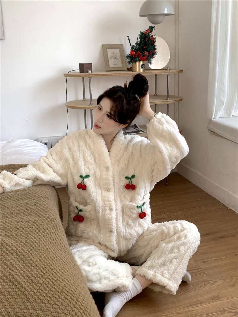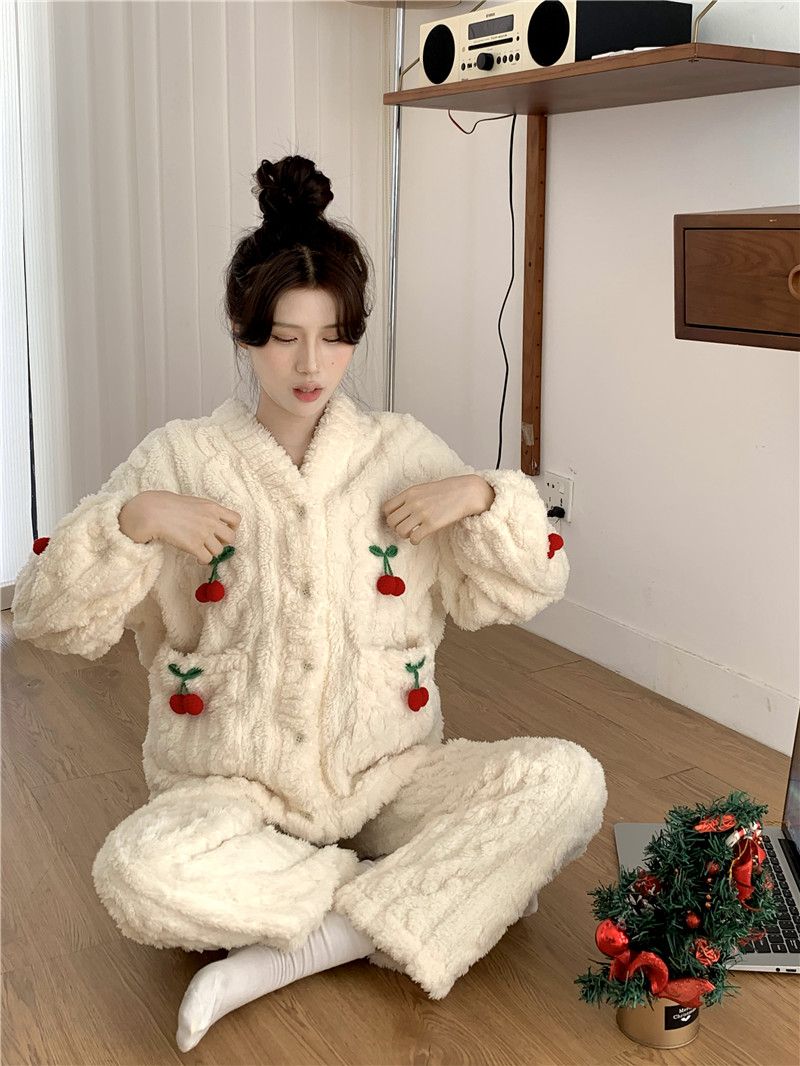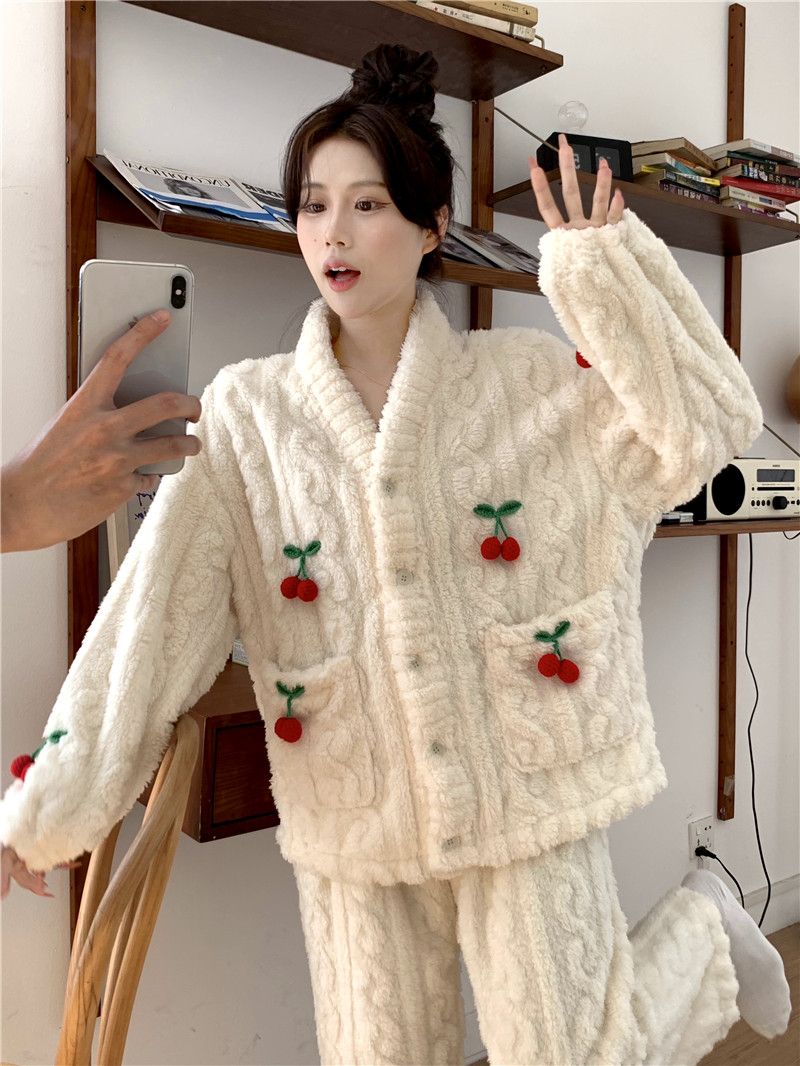 甘いさくらんぼ長袖サンゴベルベットパジャマ女性カーディガン少女小香風ベルベット厚い保温家庭服冬メガ割 メガ割 秋冬 裏起毛 ルームウェア 上下セット 長袖