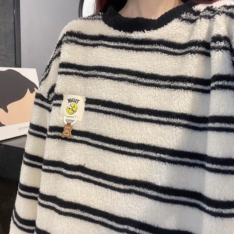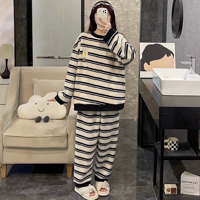 サンゴのパジャマ女性冬の新型ストライプ韓国系シンプルins風秋冬モデルは家庭服セットを着ることができるメガ割 メガ割 秋冬 裏起毛 ルームウェア 上下セット 長袖