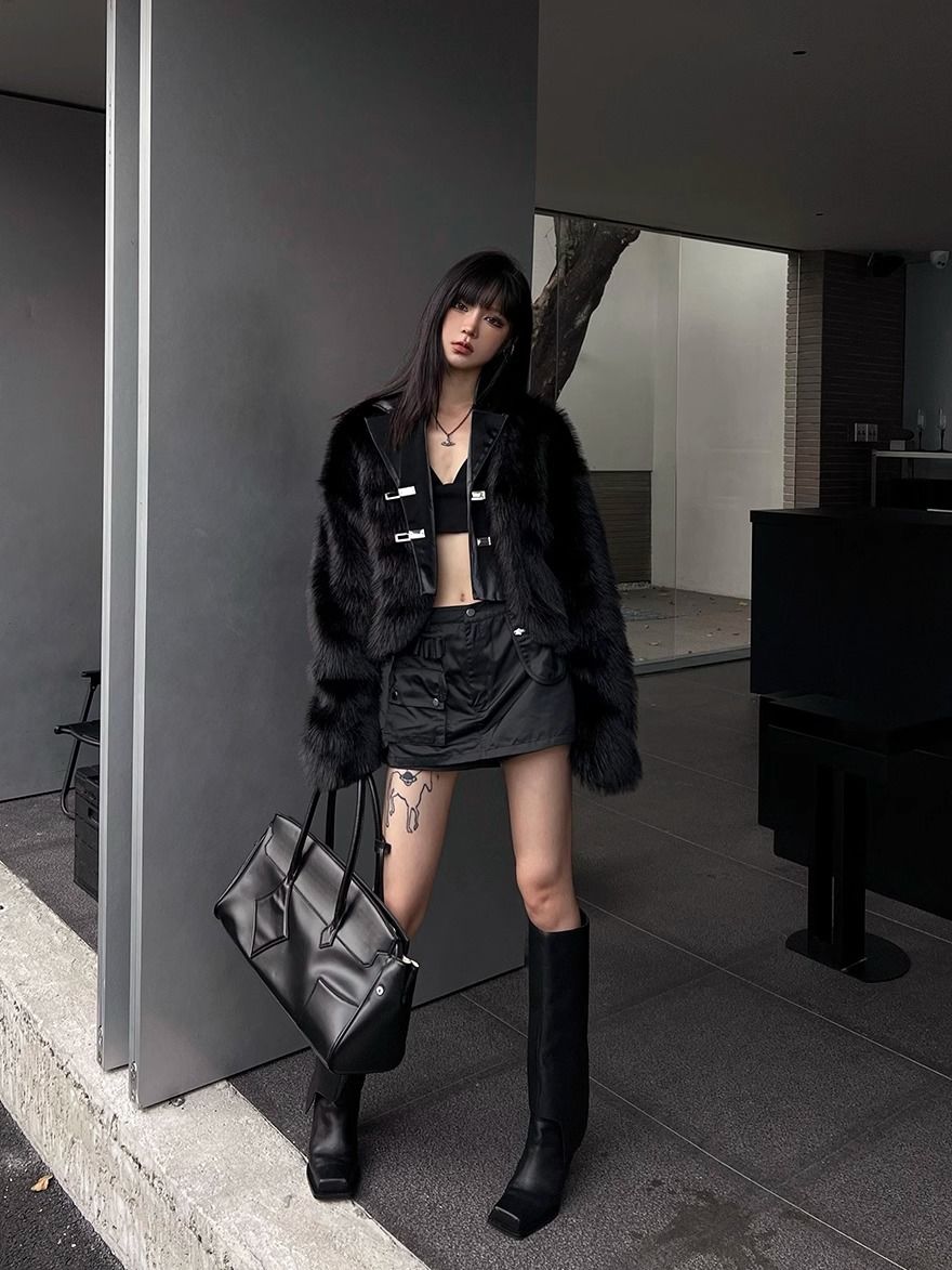 冬アウター 黒ファーコート 韓国ファッション 秋冬モコモコ保温厚手トップス ジャケット ジャケット ファー 毛皮アウター