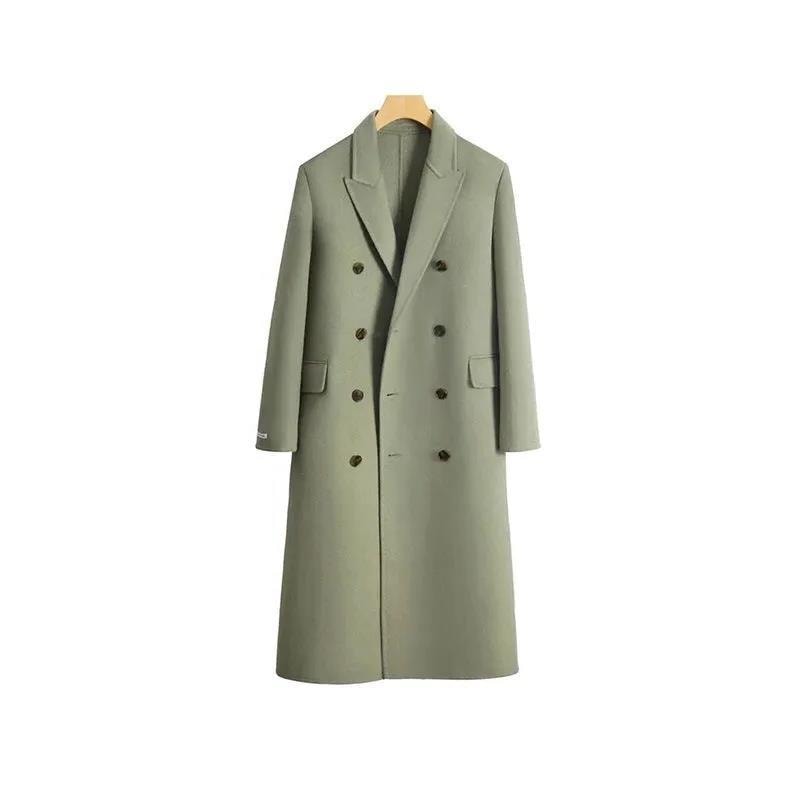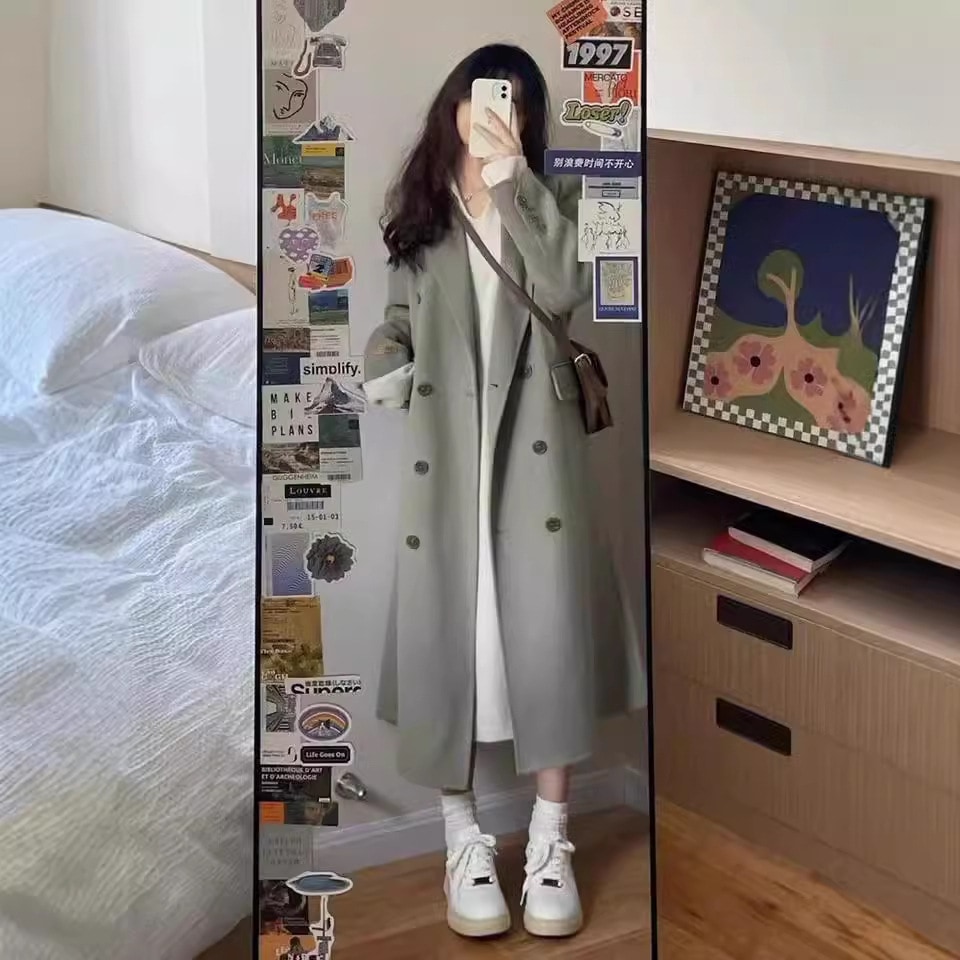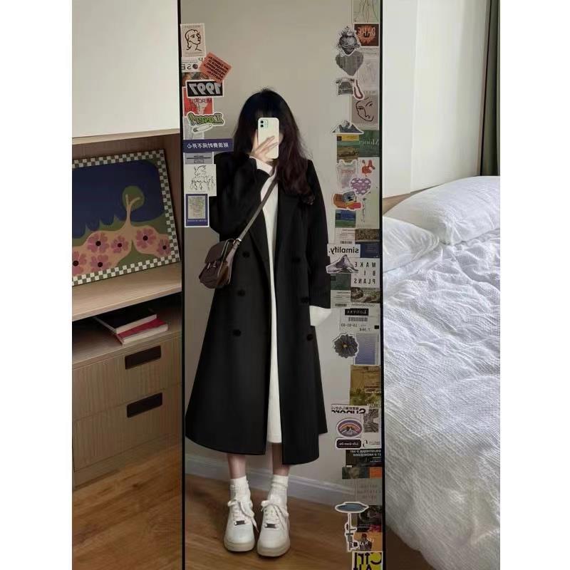 冬アウター 香港スタイルソリッドカラーミディアムレングスツイードトレンチコートジャケット女子学生秋冬韓国ヘップバーン風ルーズ暖かいコート トレンチコート