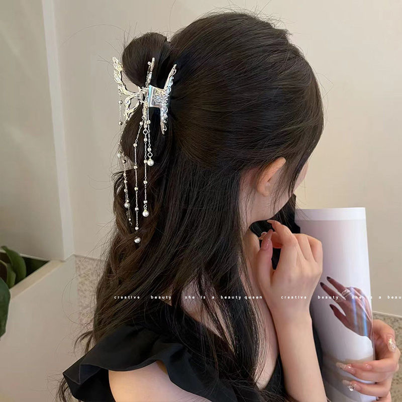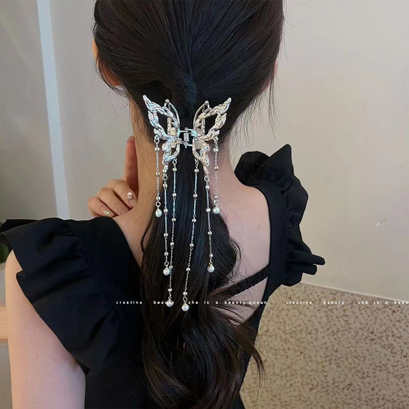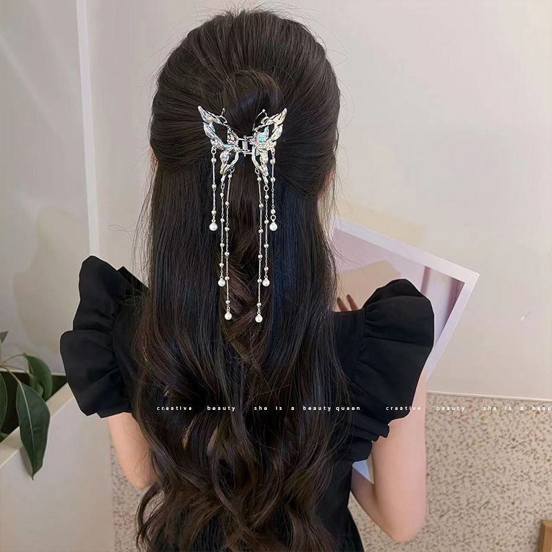 ヘアピン 金属蝶タッセルパールグラブクリップ女性2024新しいヘアクリップ半分ネクタイ髪ポニーテールシャーククリップ ヘアクリップ