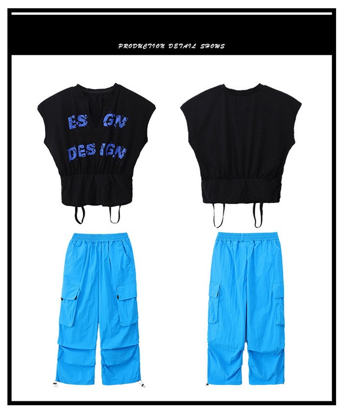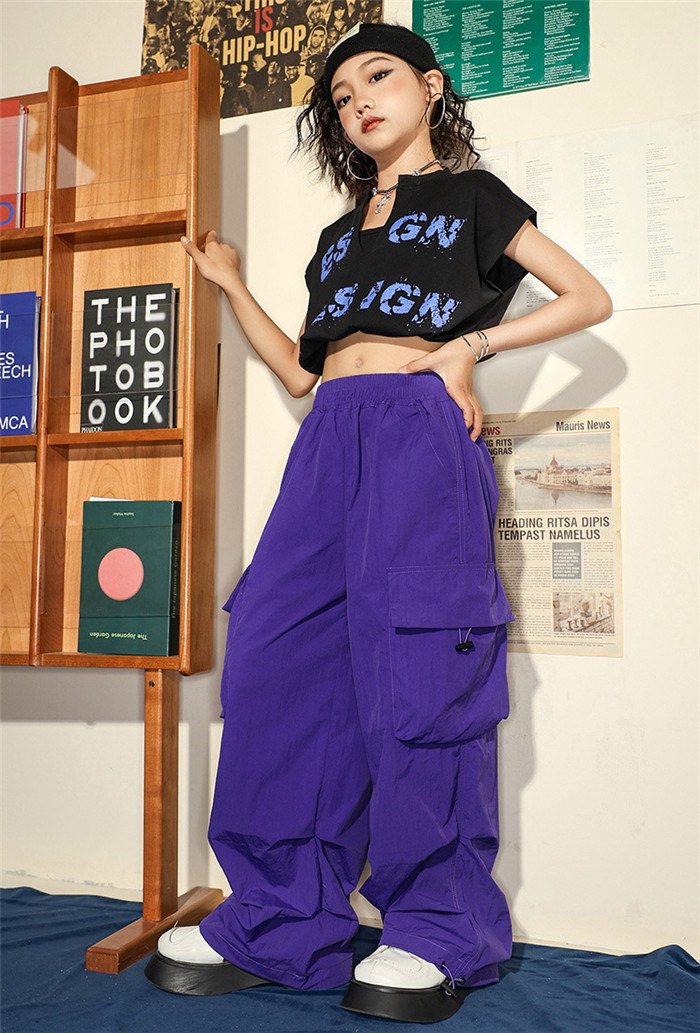 キッズダンス衣装 tシャツ ダンス衣装 トップス 黒 ブルー 紫 黄色 ダンス 衣装 ヒップホップ キッズ カーゴパンツ 子供 ダンスズボン カーゴ パンツ hiphop k-pop ショート丈 トッ