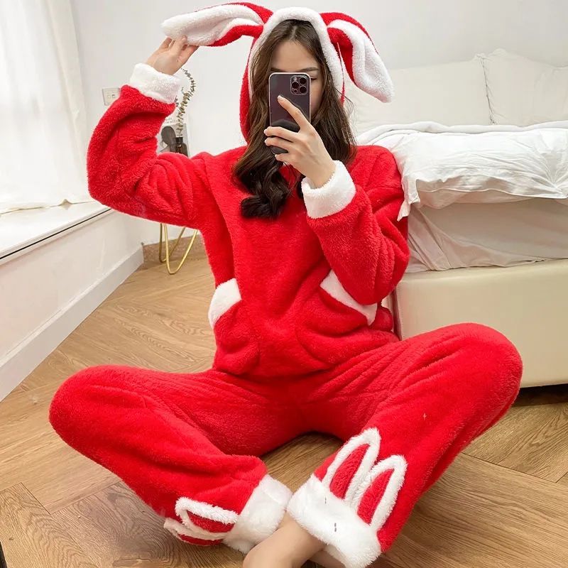 秋 冬 新作 コーラルフリース 裏起毛 厚手 パジャマ 快適性 可愛い フード付きルームウェア パジャマ