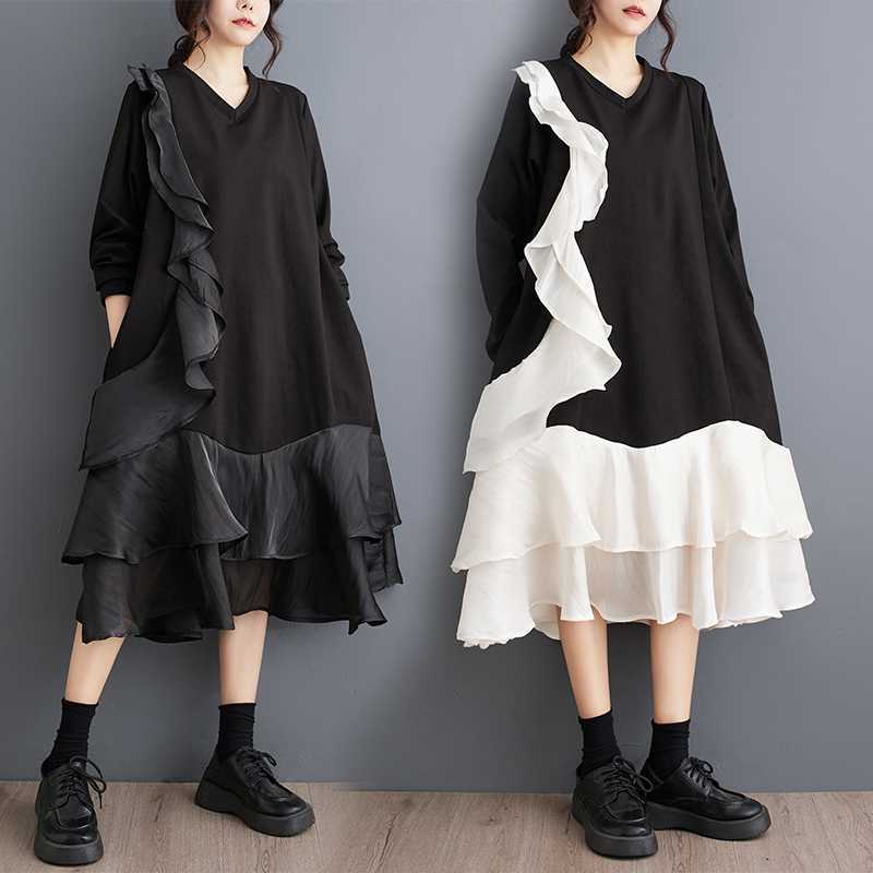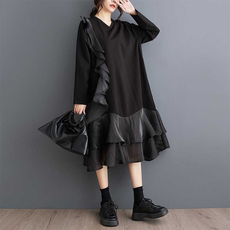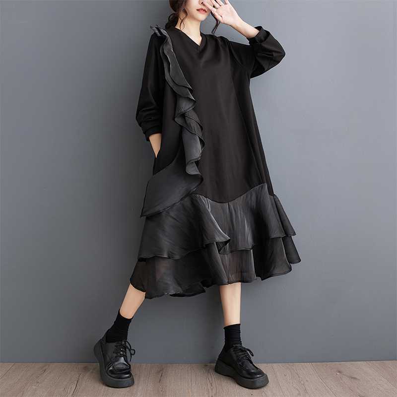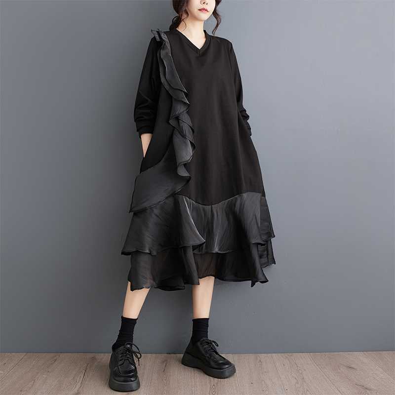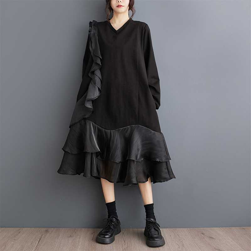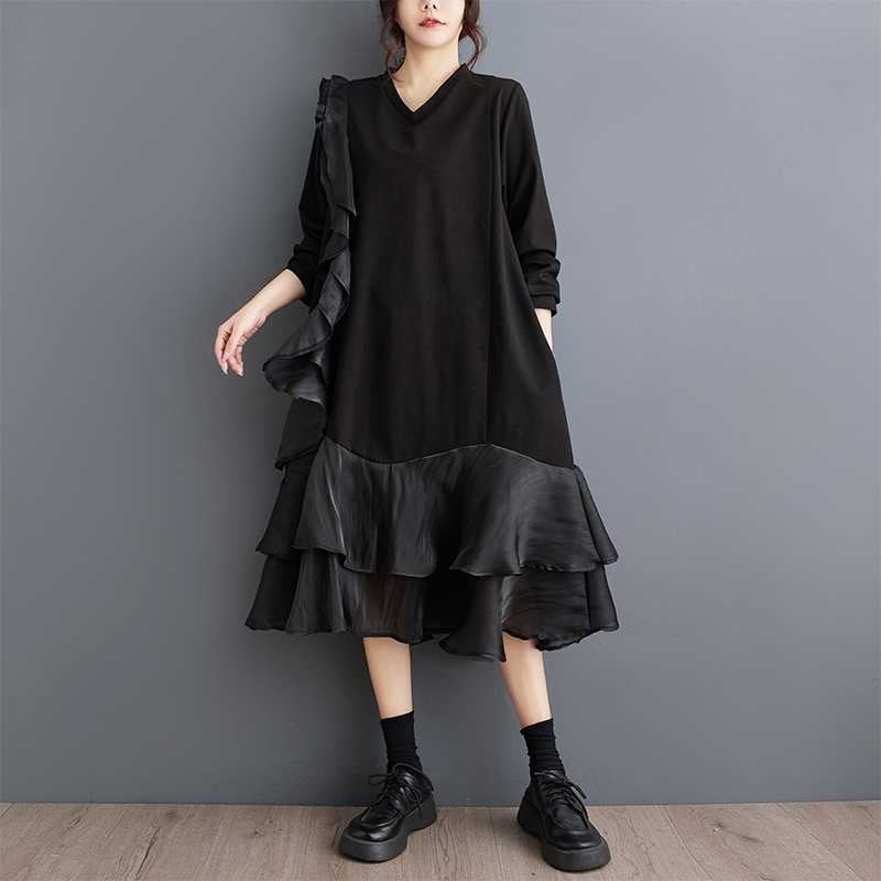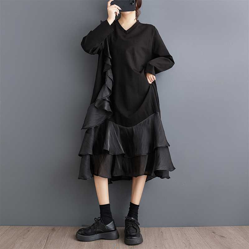 2024秋新品 フリフワンピース 大きいサイズ 体型カバー レディース vネック ドッキング ロングワンピース メガ割 シャツワンピ