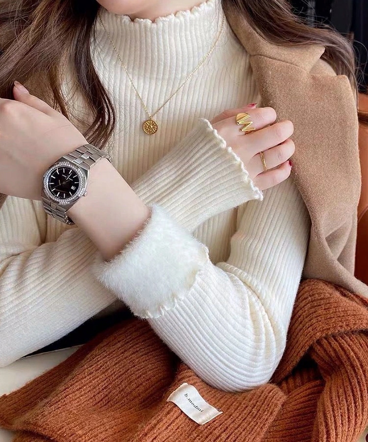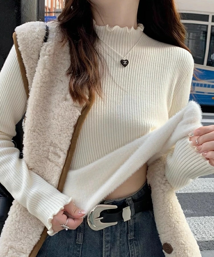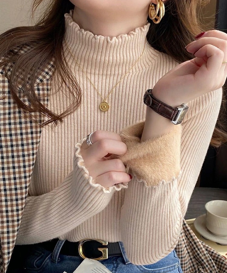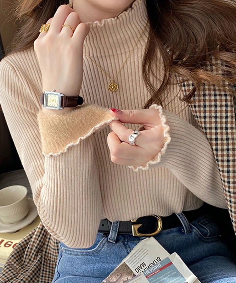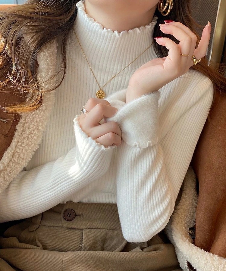 裏起毛 ハイネック ニット セーター トップス 裏ファー レディース リブ フリルネック フリル 長袖 タートルネック 無地 暖かい 厚手 オフィスカジュアル きれいめ 春秋冬 重ね着