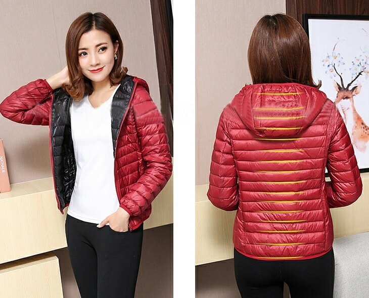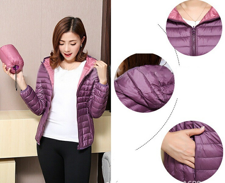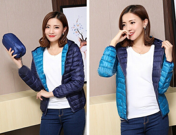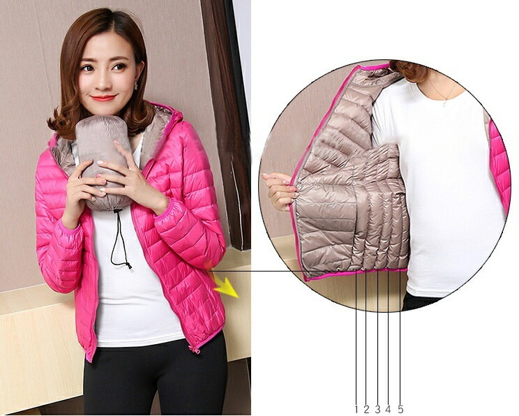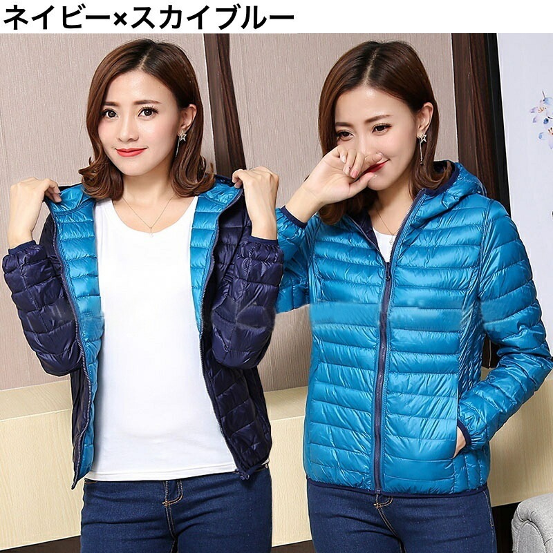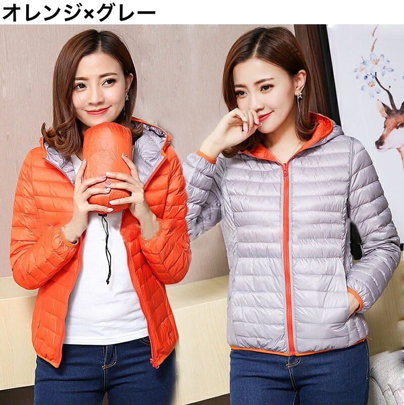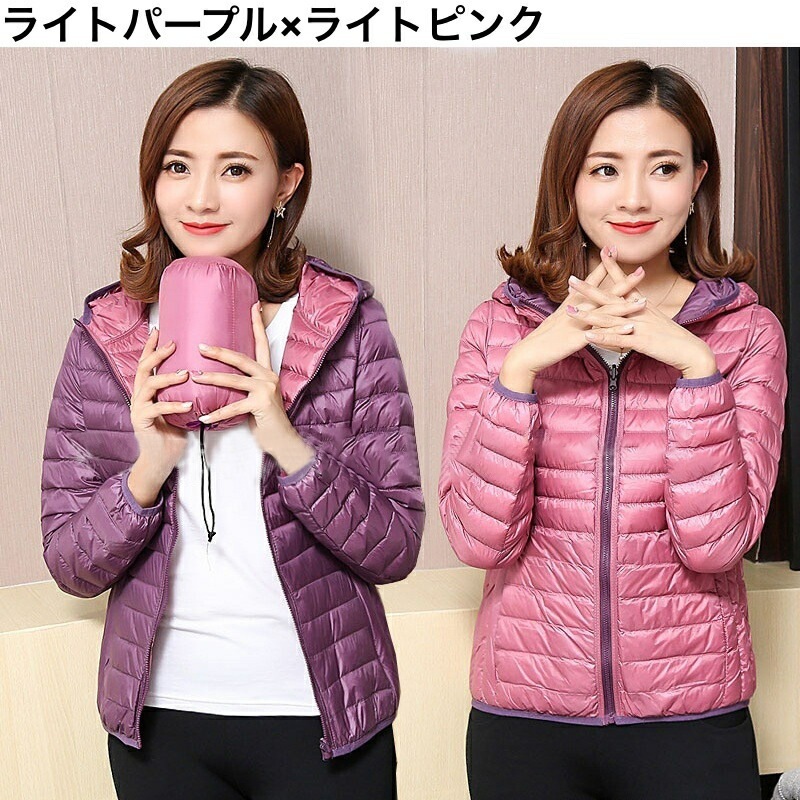 中綿ジャケット 中綿入りジャンパー ダウン風 リバーシブル 収納袋付き レディース 女性 アウター 上着 ライトジャケット 薄手 長袖 フード付き ジップアップ 大きいサイズあり 秋 冬 無地 カジュ