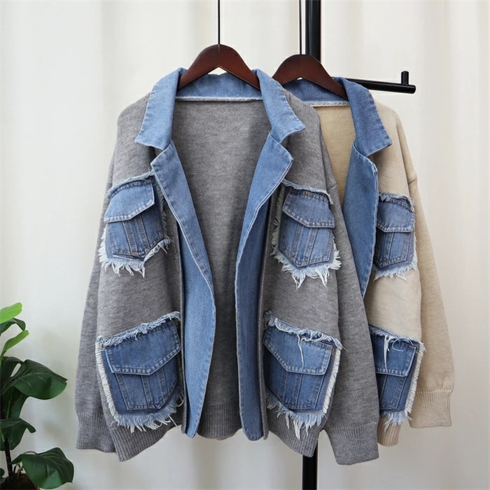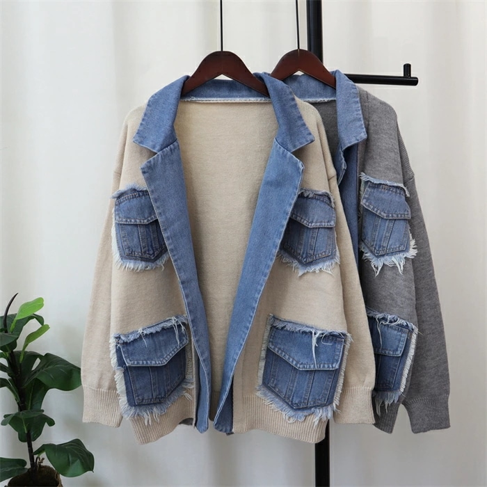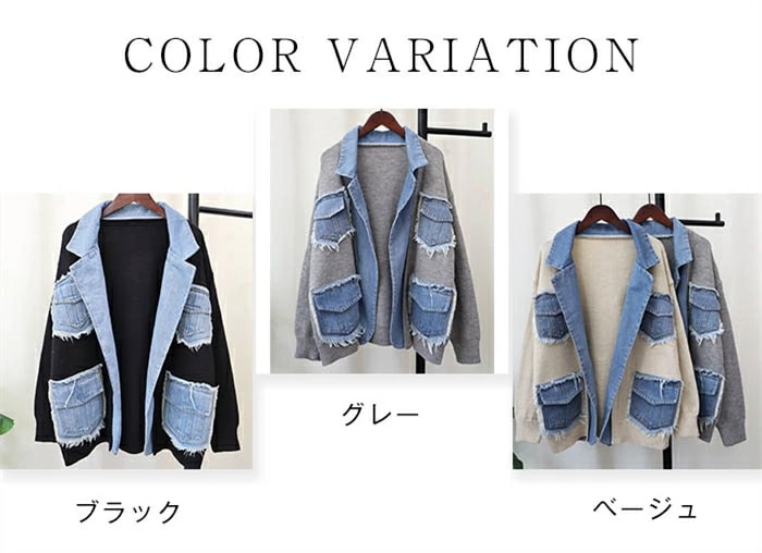 デニム 切り替え ニットカーディガン カーディガン 羽織り アウター バイカラー カーデ ショート丈 異素材 ドッキング コート レディース ジャケット あったか Vネック ショート ゆったり 柔ら