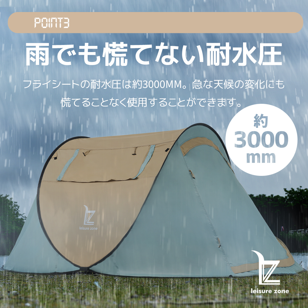 【雨でも慌てない耐水圧】フライシートの耐水圧は約3000mm。急な天候の変化にも慌てることなく使用することができます。 耐水圧とは 生地に染み込もうとする水の力を抑える性能数値を指し、耐水圧3000mmは生地の上に高さ300cmの水が生地の上に乗るまで染み出さずに、水圧に耐えられるということを示します。 一般的な傘の耐水圧 500~1000mm 強い雨 1500mm 本製品 約3000mm