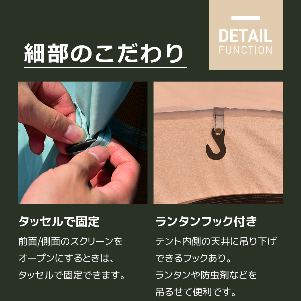 【ランタンフック付き 】テント内側の天井に吊り下げできるフックあり。 ランタンや防虫剤などを吊るせて便利です。