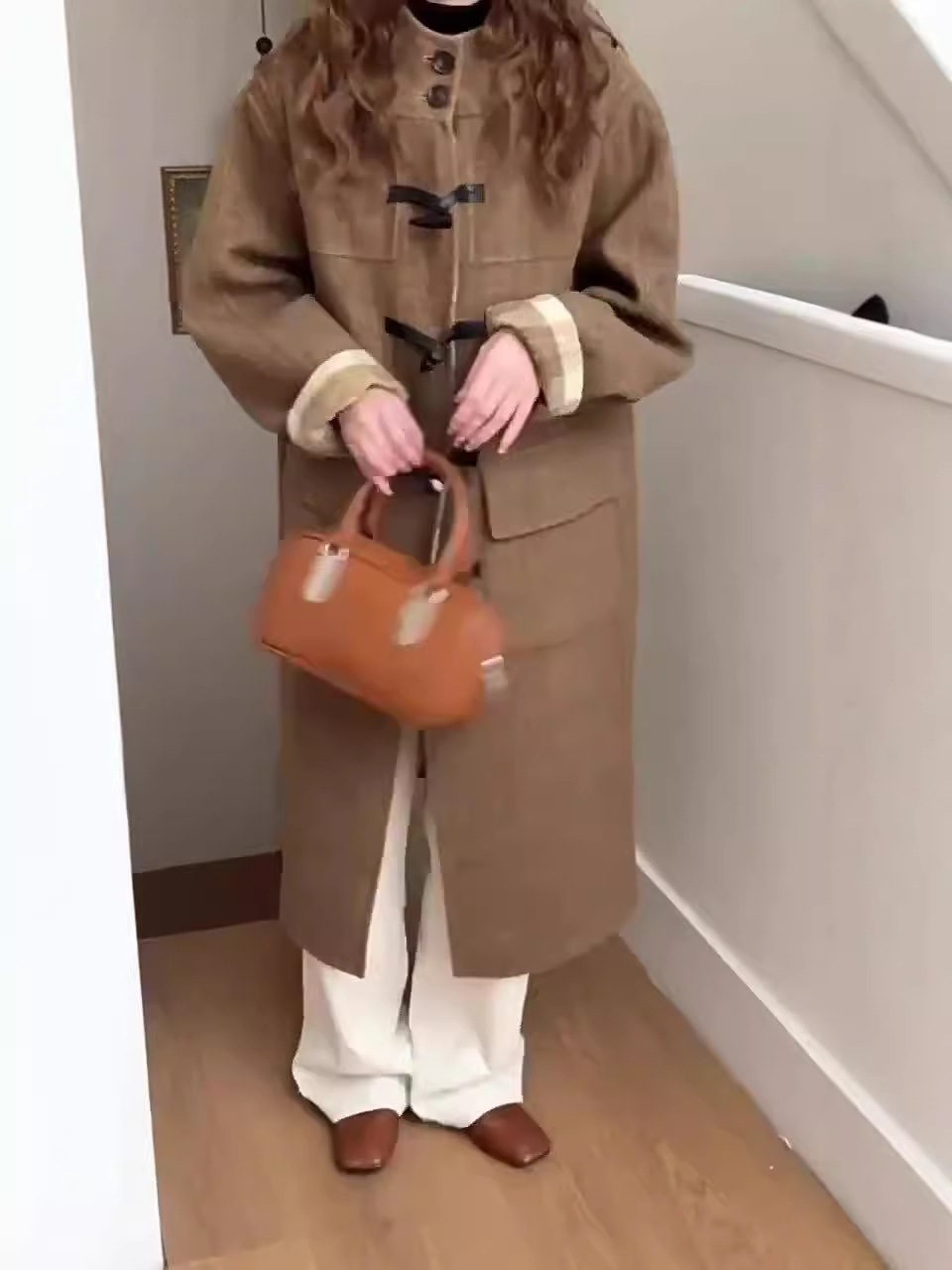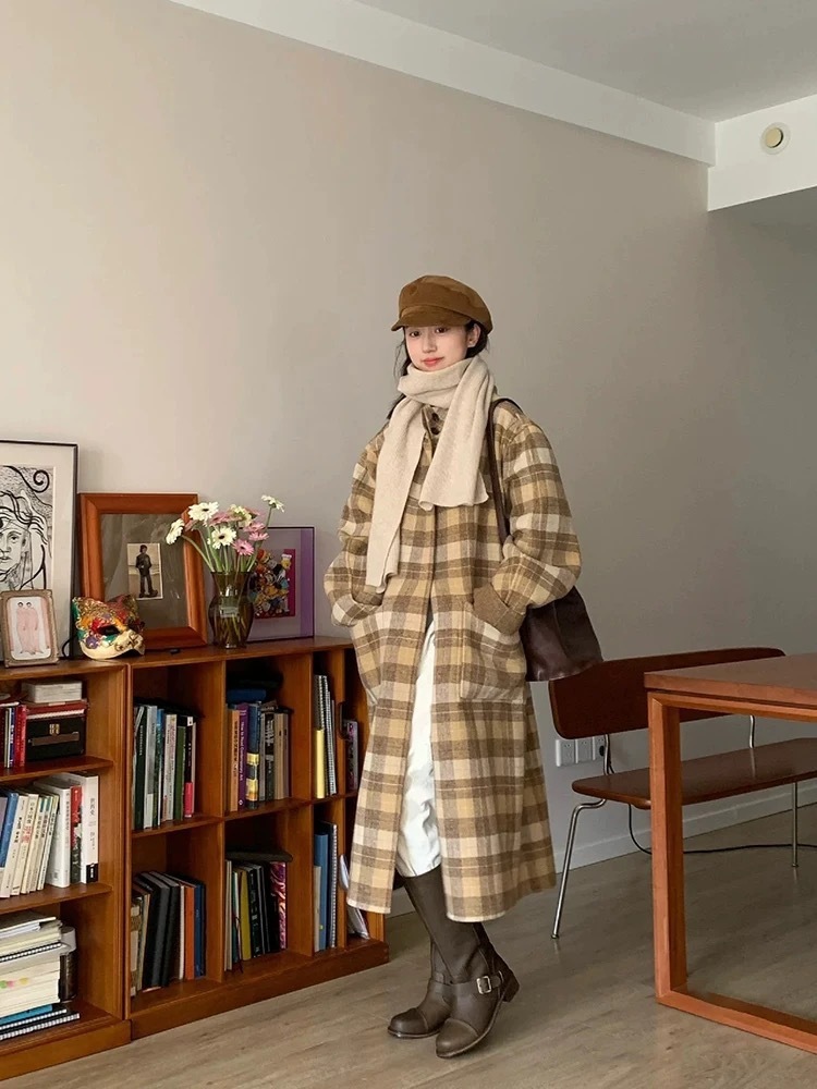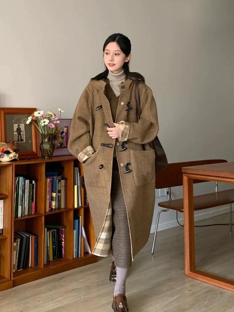 両面着用両面ウールコートの女性の長い段落格子縞フード付き気質韓国ウールツイードのプレミアム感覚 女性用コート ファー 毛皮アウター