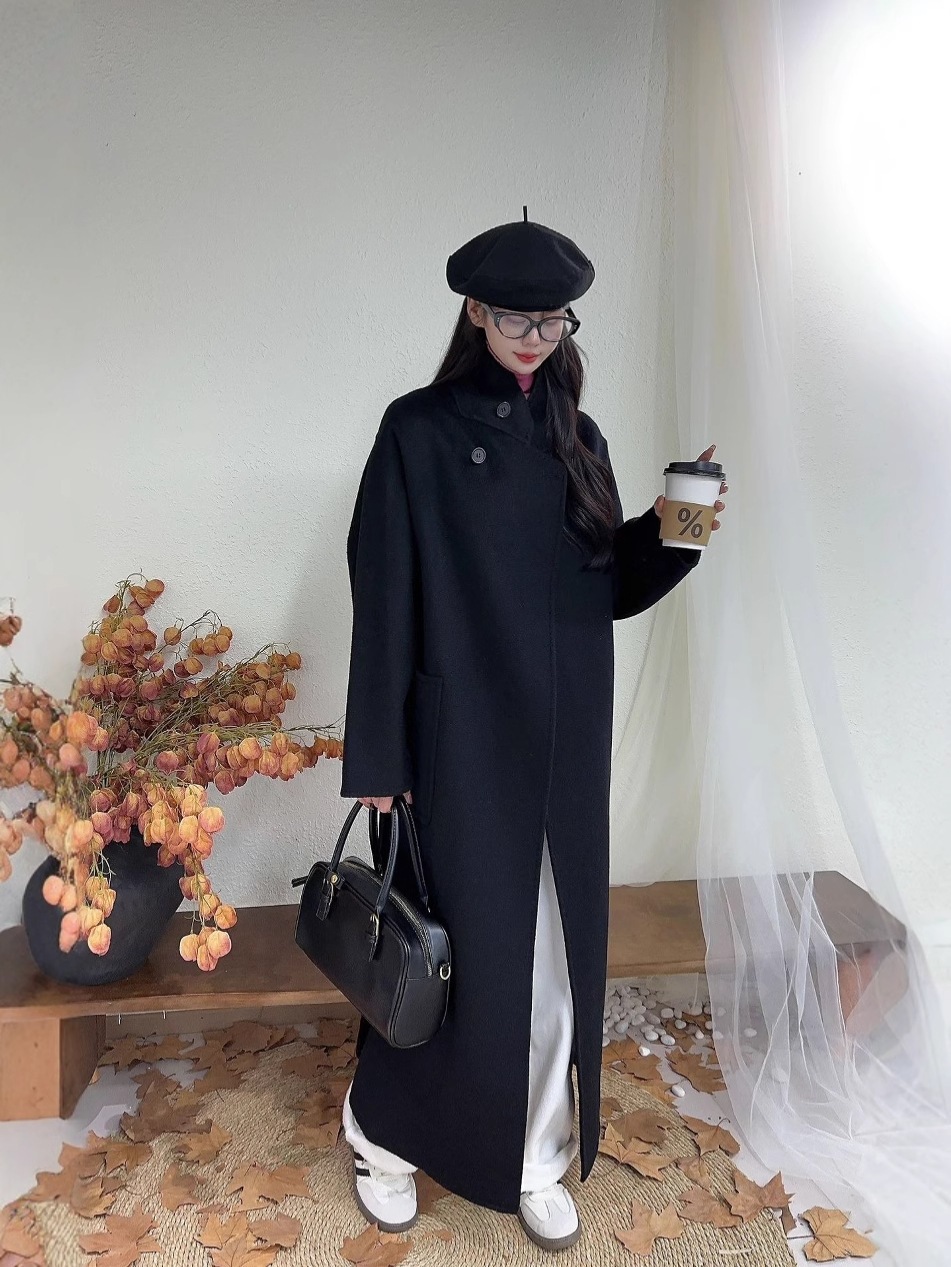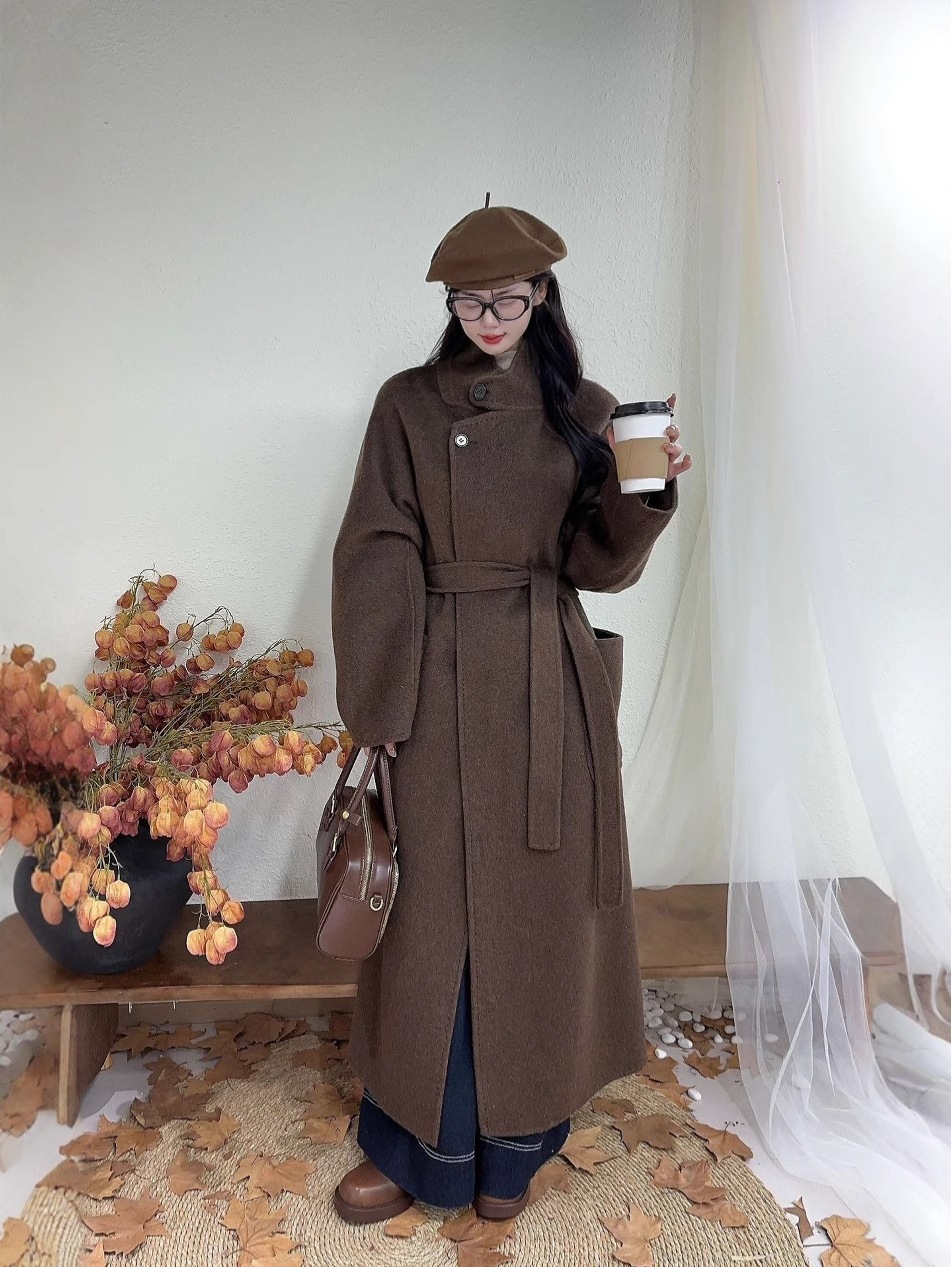 襟タイウエスト両面カシミアコート女性秋冬モデル膝ルーズツイードジャケットのロングセクションの韓国語バージョン ファー 毛皮アウター