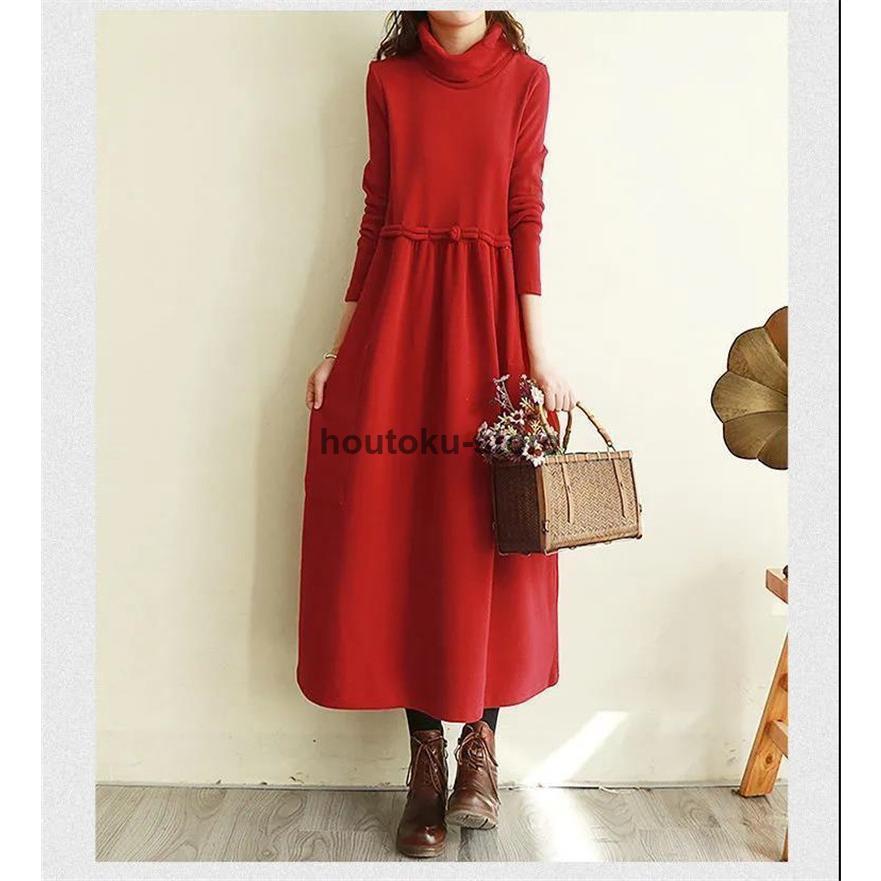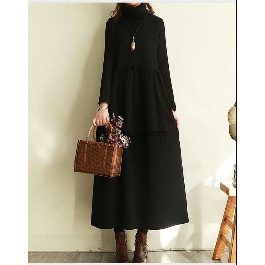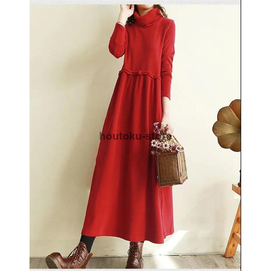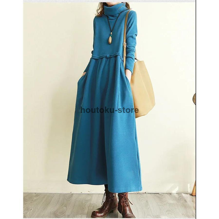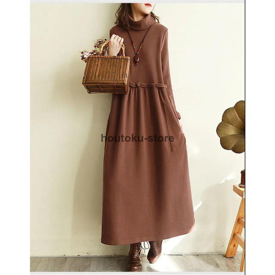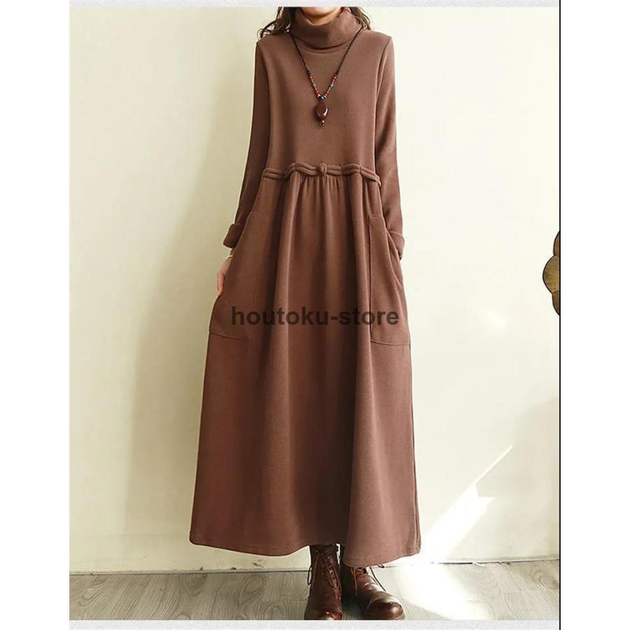 ワンピース マキシワンピース レディース ロングワンピ 秋冬 ハイネック チュニック タートルネック マキシ 無地 微起毛 裏起毛 冬 ポケット付き リラックス