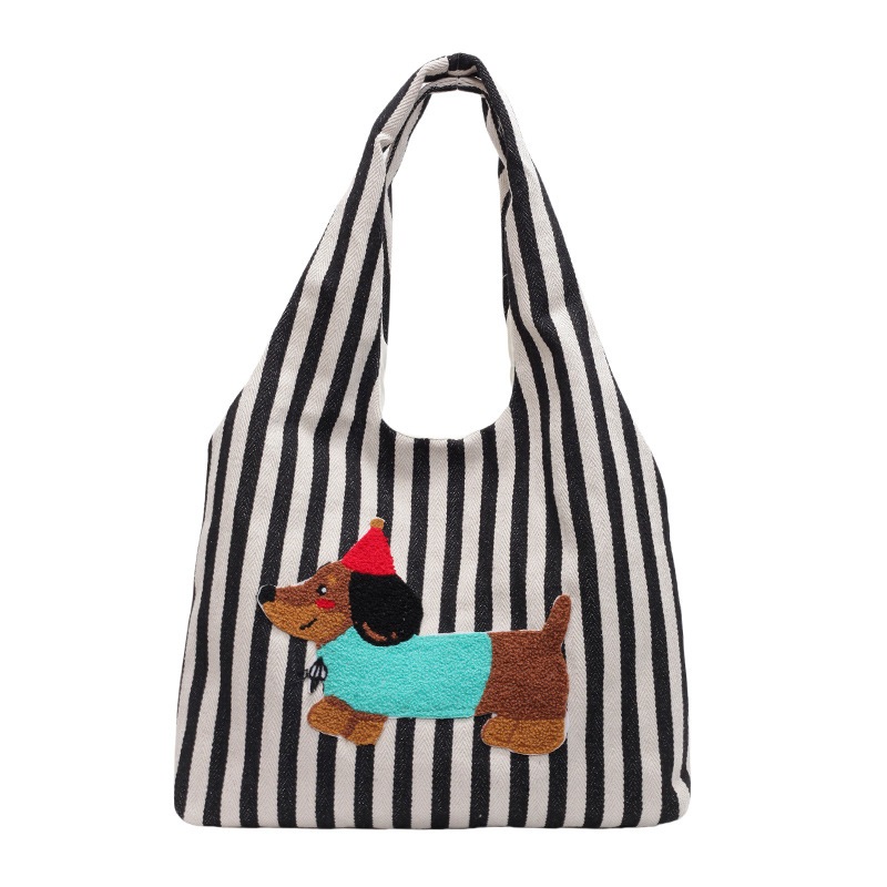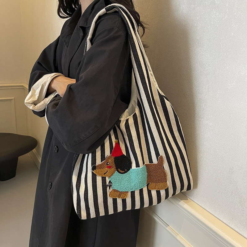 かわいい漫画刺繍子犬ショルダーバッグファッションストライプキャンバス手持ち脇バッグ大容量通勤トートバッグ ハンドバッグ