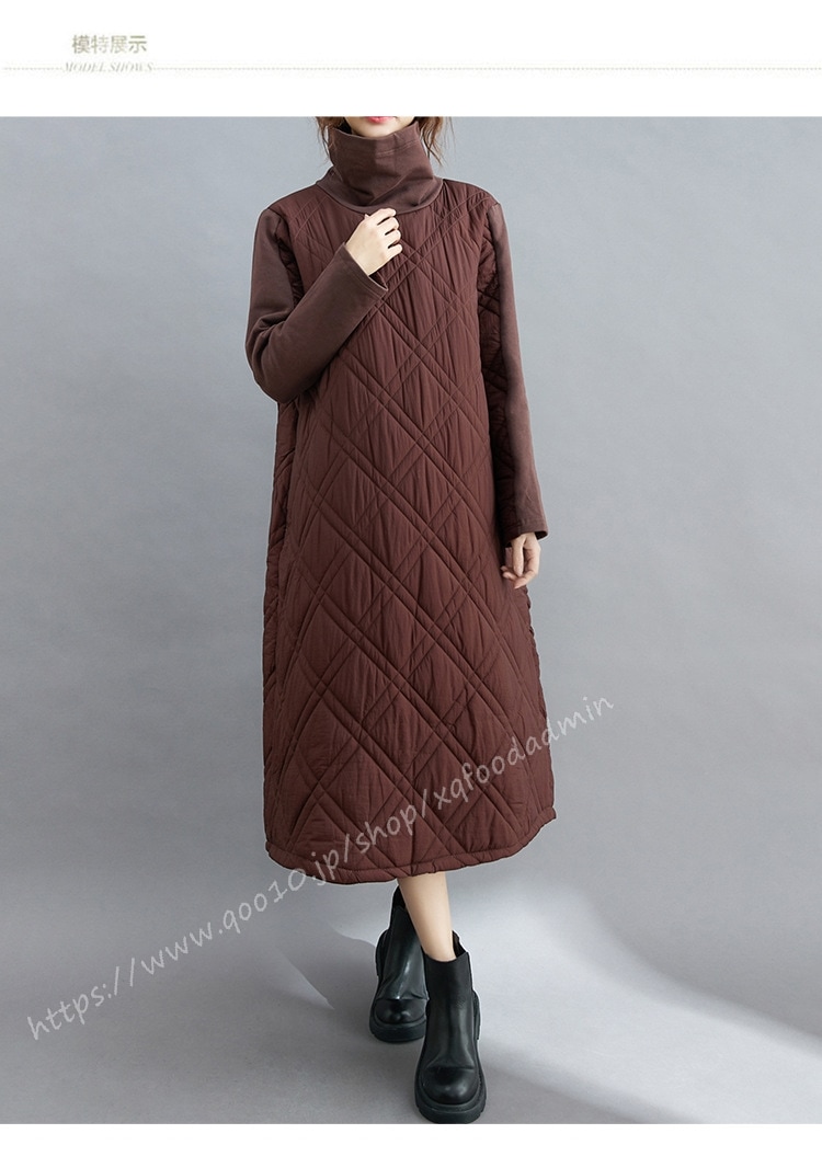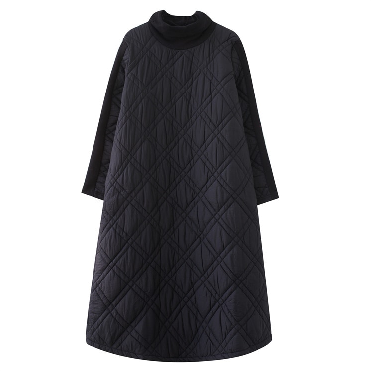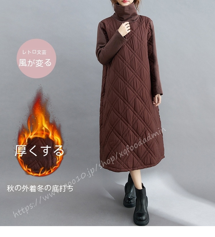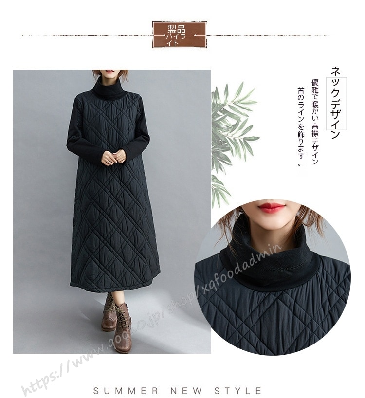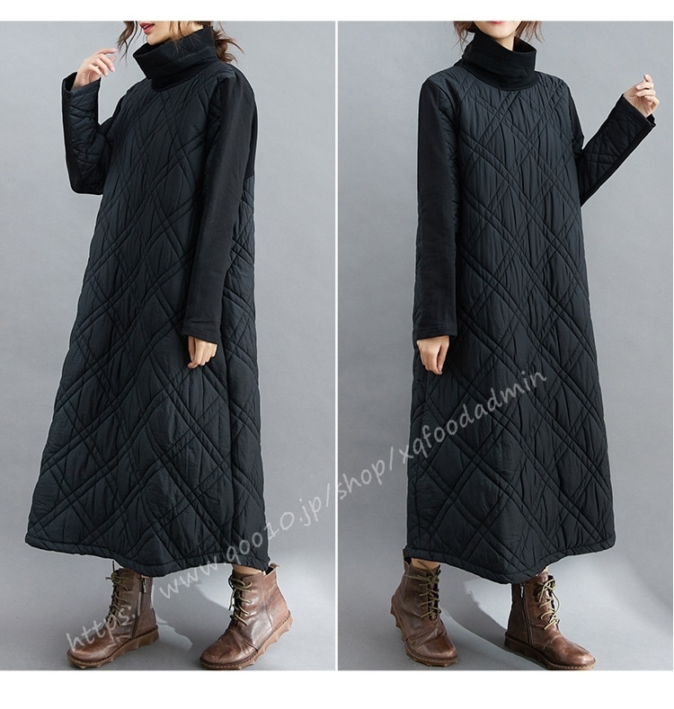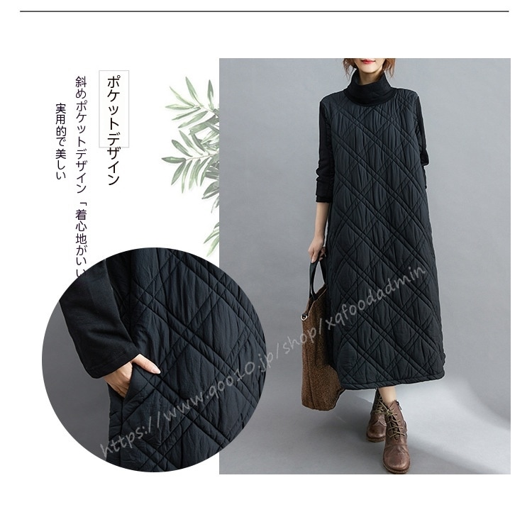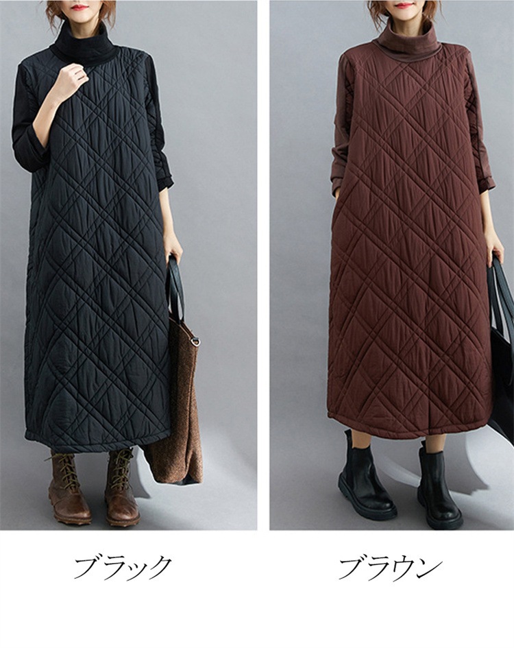 キルティング カジュアル ワンピース 黒 40代 秋 マキシワンピース 切り替え 長袖 秋冬 冬 厚手 ロングワンピースハイネック 軽量 防寒 タートルネック ポッケト付き 中綿ワンピース キルティン