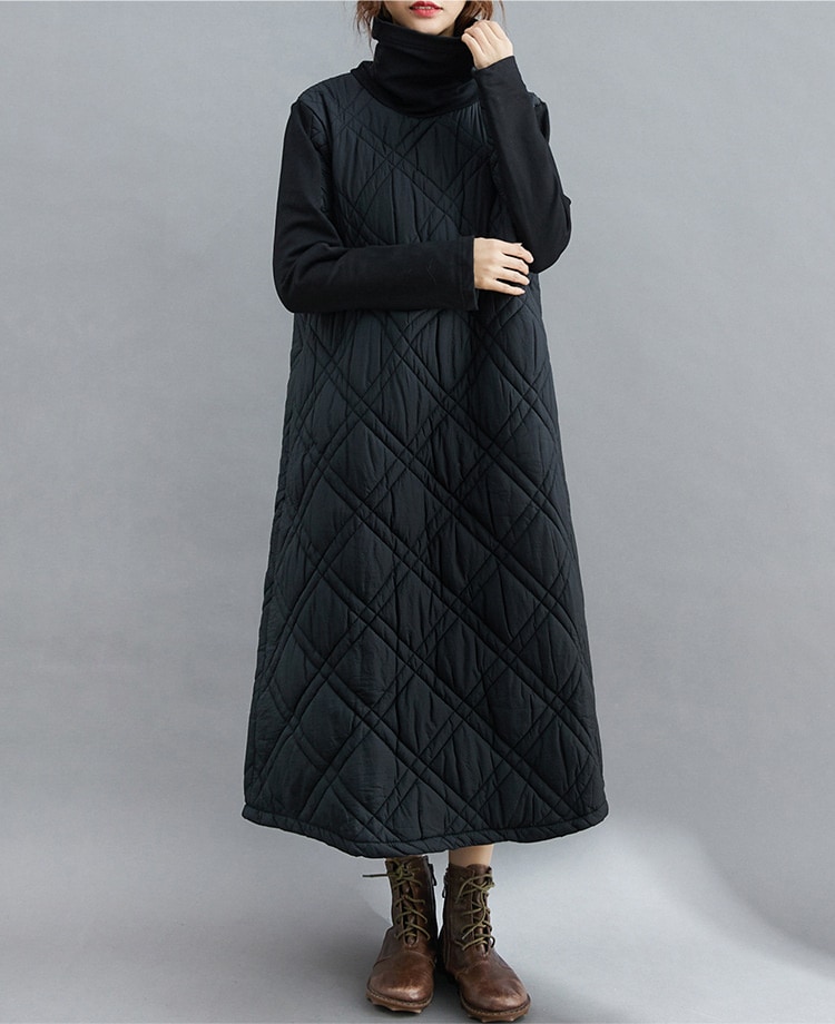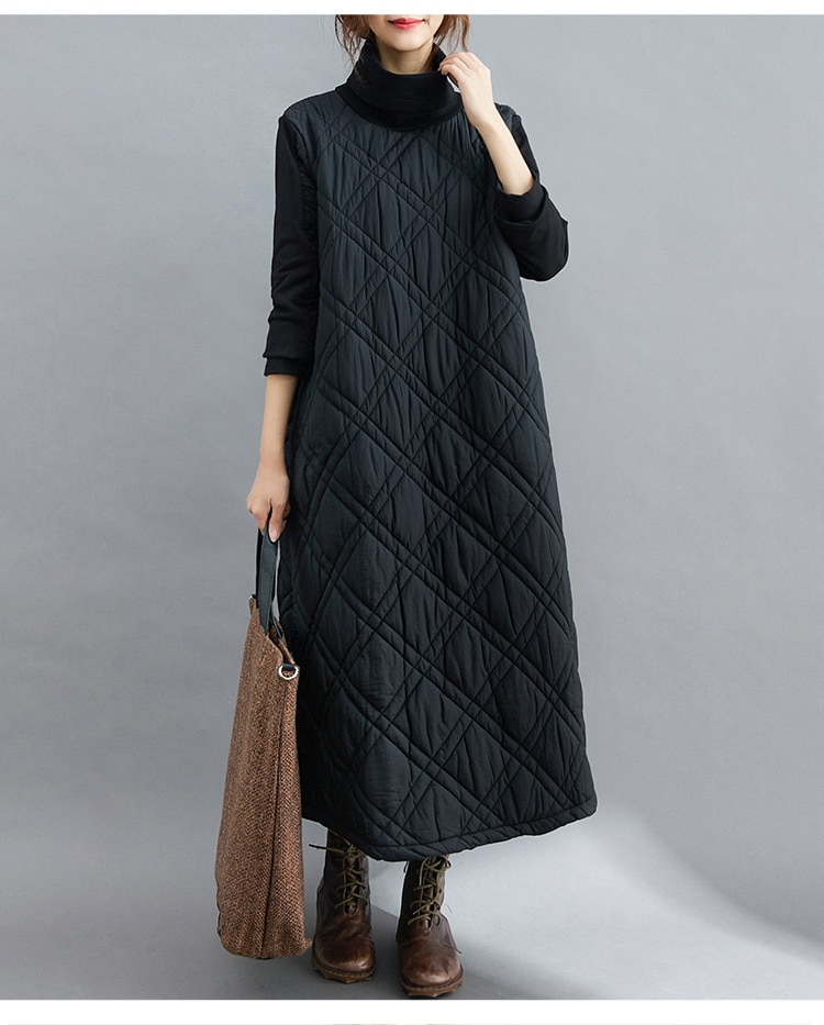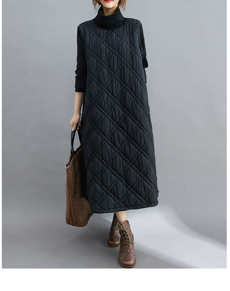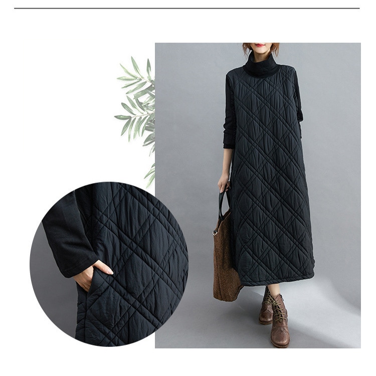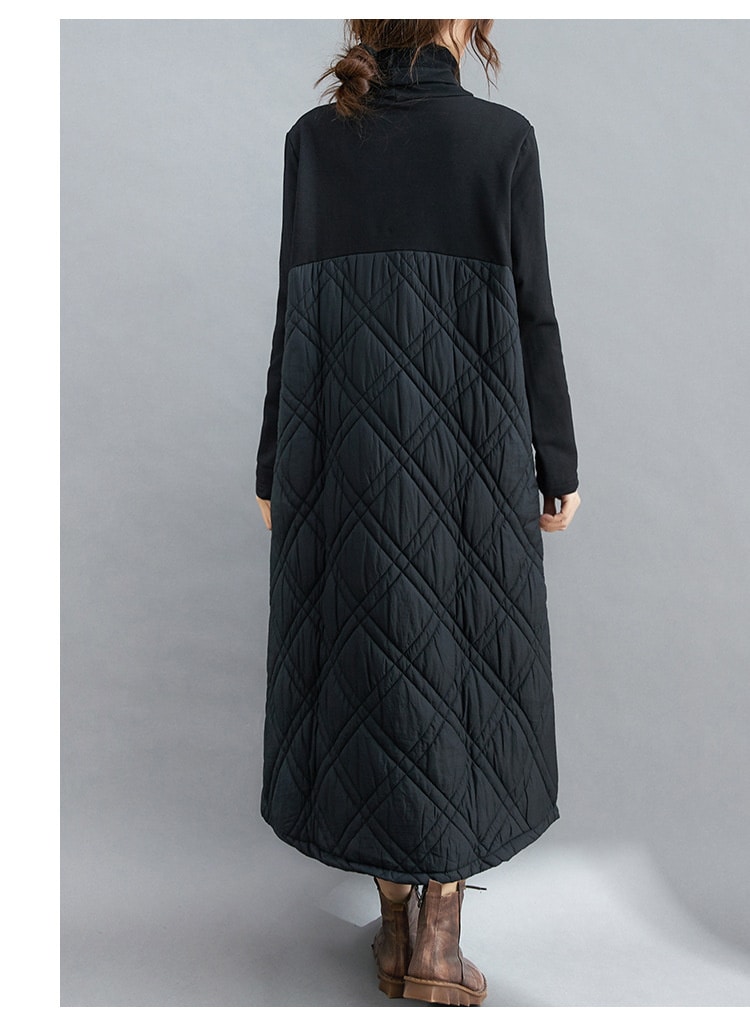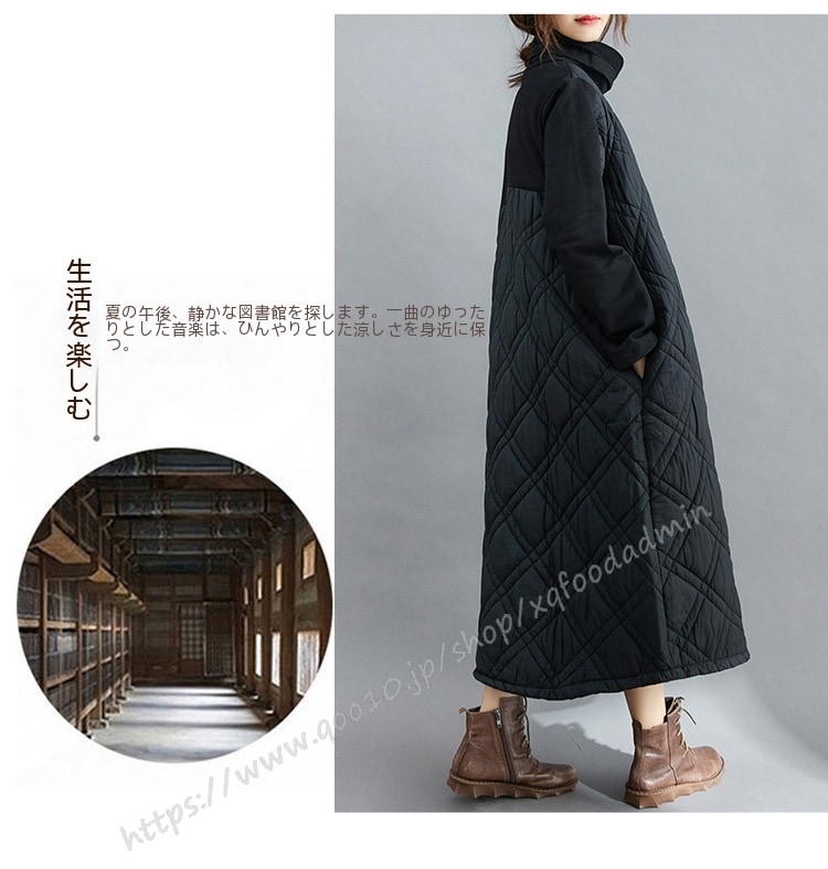 キルティング カジュアル ワンピース 黒 40代 秋 マキシワンピース 切り替え 長袖 秋冬 冬 厚手 ロングワンピースハイネック 軽量 防寒 タートルネック ポッケト付き 中綿ワンピース キルティン