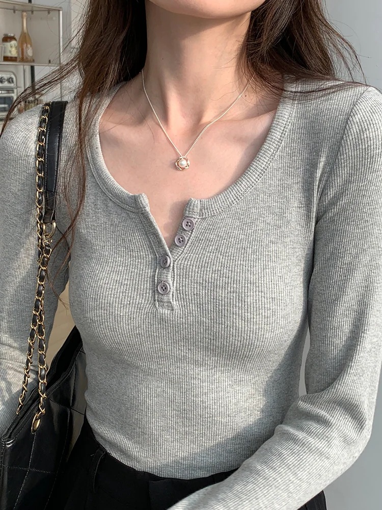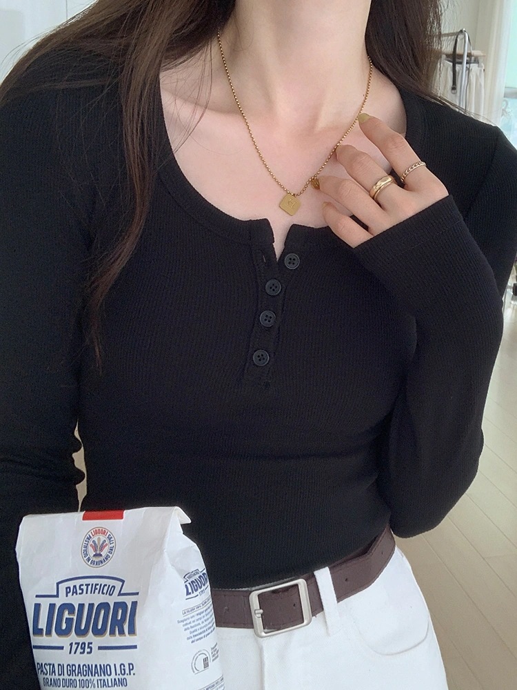 糸ボタンのプレミアム感ローネックスリムTシャツ春秋新作シックなシックな長袖女性インサイドボトムトップス Tシャツ カットソー
