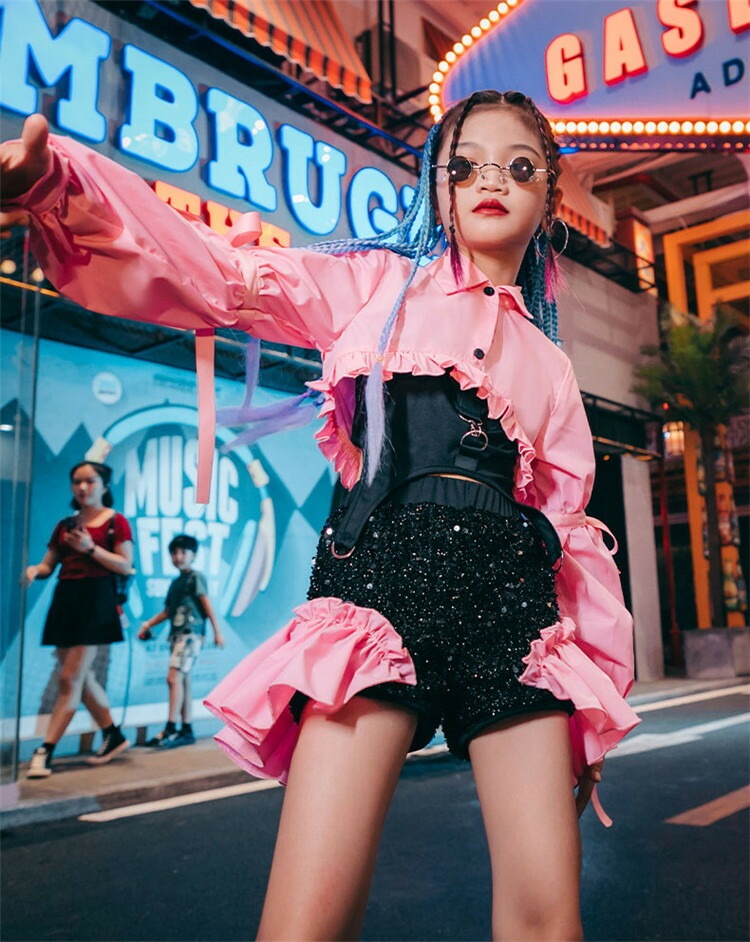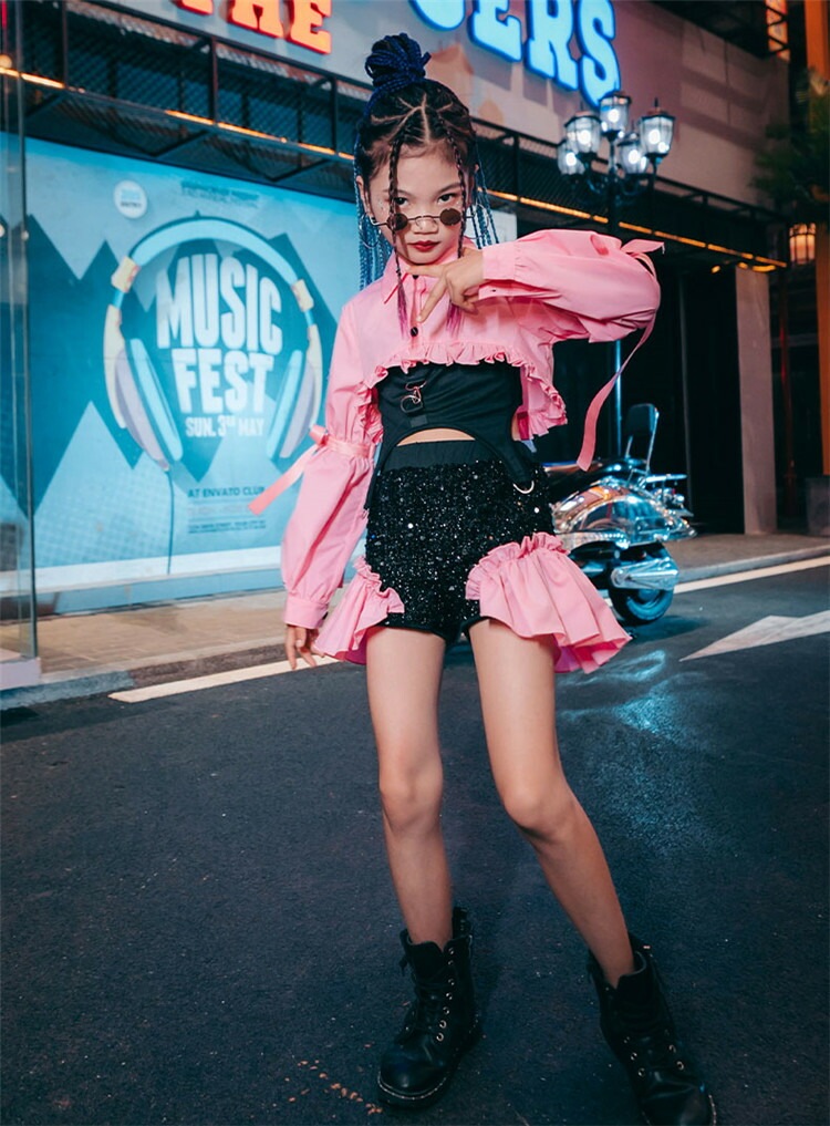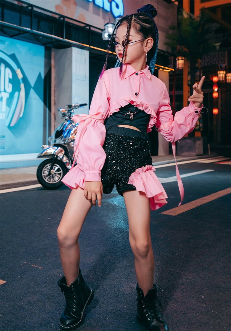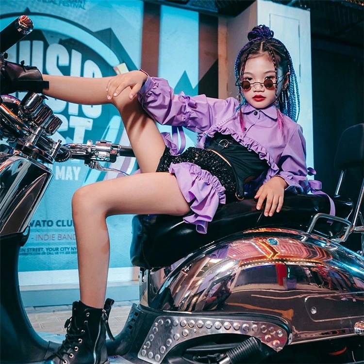 パープル ピンク イエロー セットアップ ガールズ ジャズ ダンス衣装 セットアップ スパンコール キッズ ダンス衣装 女の子 ヒップホップ チアガール 韓国 l-pop 3点セット ガールズ hip