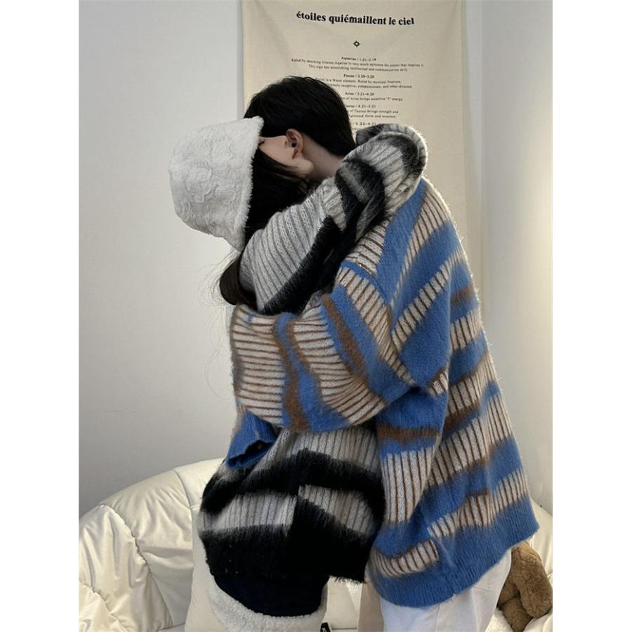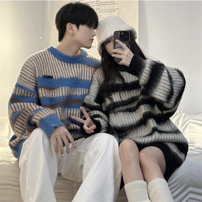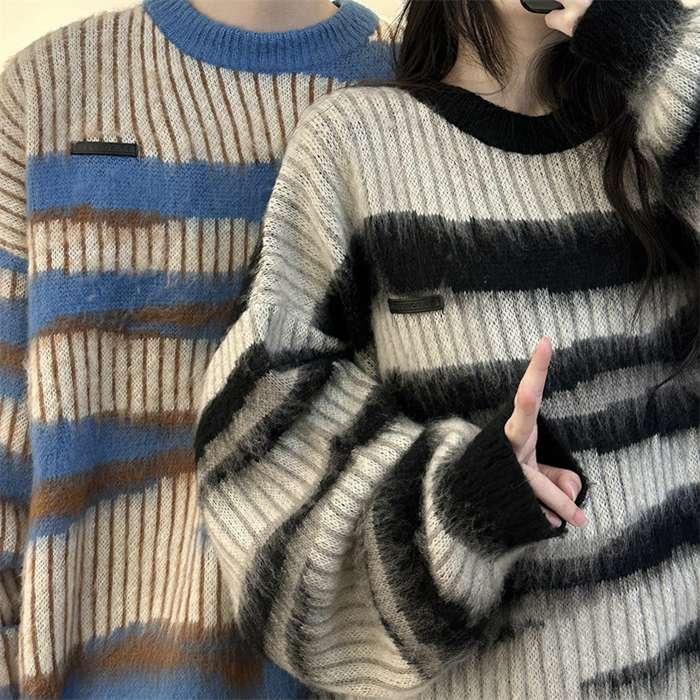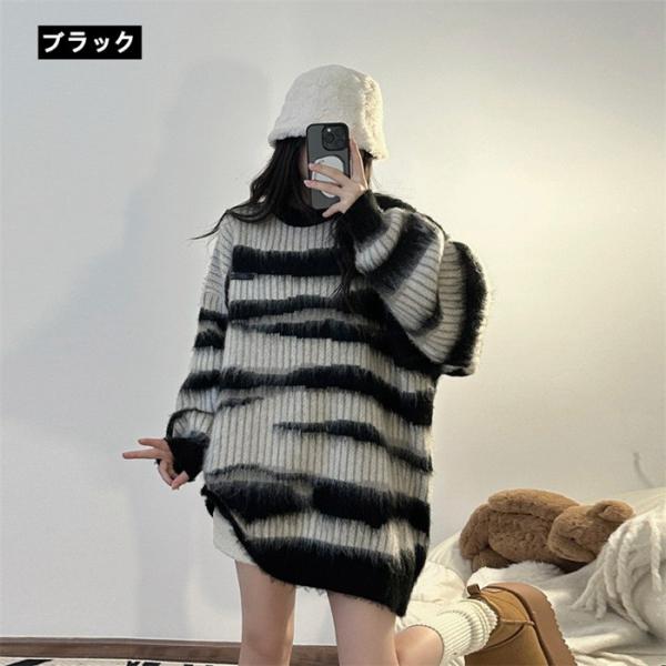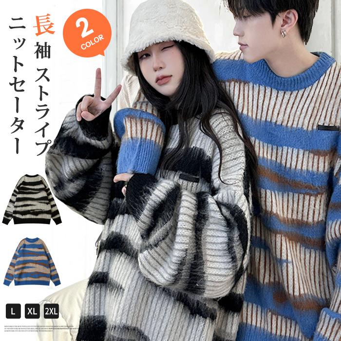 ニットセーターメンズレディースペアルックニットセータートップス長袖ストライプクルーネック ニット セーター