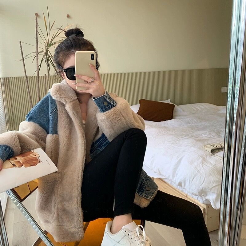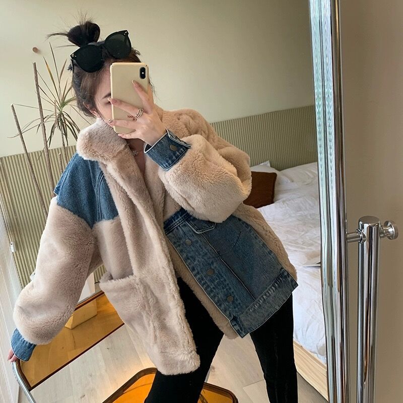 デニム切り替え 防寒 ふわふわ 厚手 毛皮 中綿ジャケット 裏起毛 皮毛一体 ラムズウール ディアフリース ダウンジャケット スウェット パーカー マウンテンパーカー プラッシュ イーザッカ