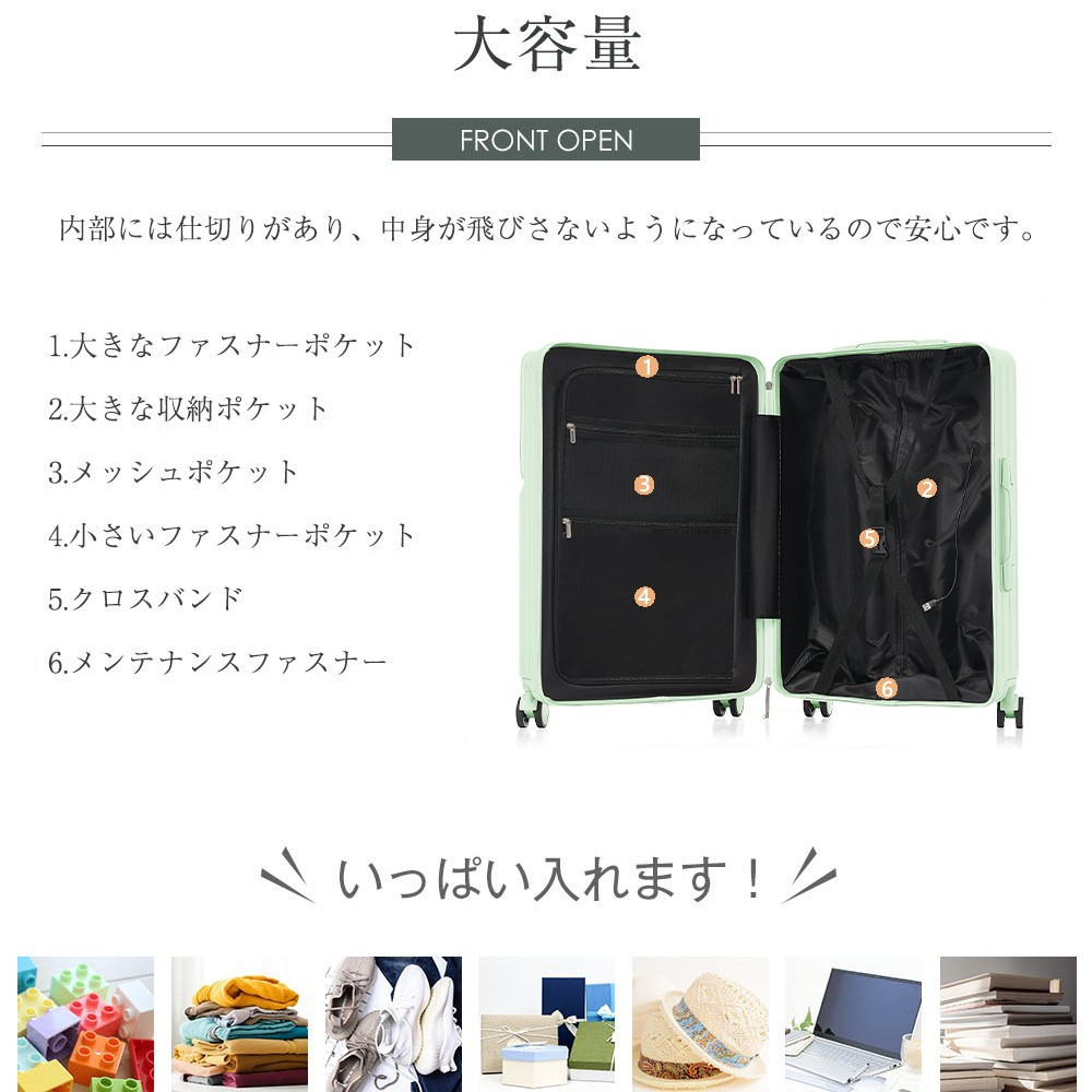 POINT 7.【大容量】内部には仕切りがあり、中身が飛びさないようになっているので安心です。お服、靴、パソコンなどいっぱい入れます!※ご注意:メンテナンスファスナー:つまみ部分は構造上お付けしておりません。また、ファスナー部を開閉し中に荷物を入れることはできませんので、ご注意ください。