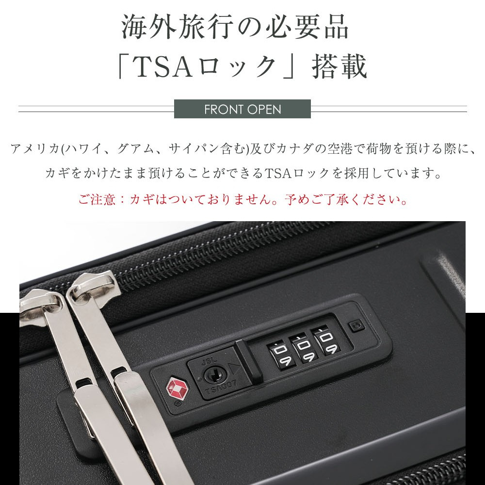 POINT 6.【海外旅行の必要品「TSAロック」搭載】アメリカ(ハワイ、グアム、サイパンを含む)及びカナダの空港で荷物を預ける際に、カギをかけたまま預けることができるTSAロックを採用しています。※ダイヤルは工場出荷時【0-0-0】で設定されています。