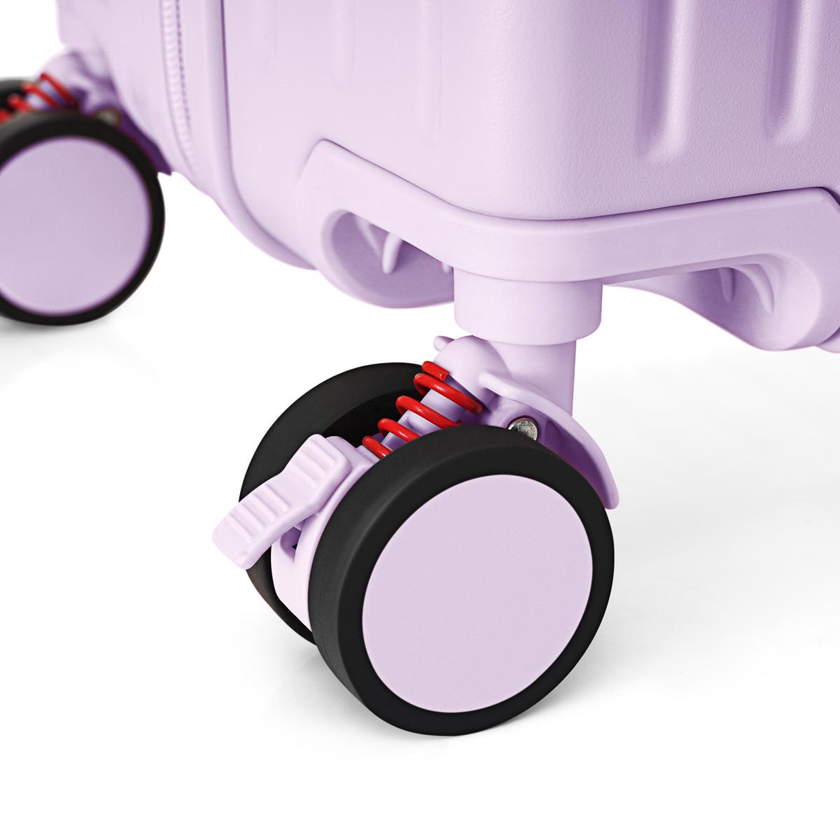 POINT 3.【ストッパー付き静音サスペンションキャスター】サスペンションキャスターは地面の凸凹などによる振動・衝撃を吸収し、振動音を抑えてくれます。ストッパーもついているため、電車が摇れても固定できて安心です。※キャスターの直径:53mm