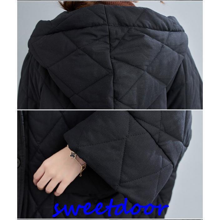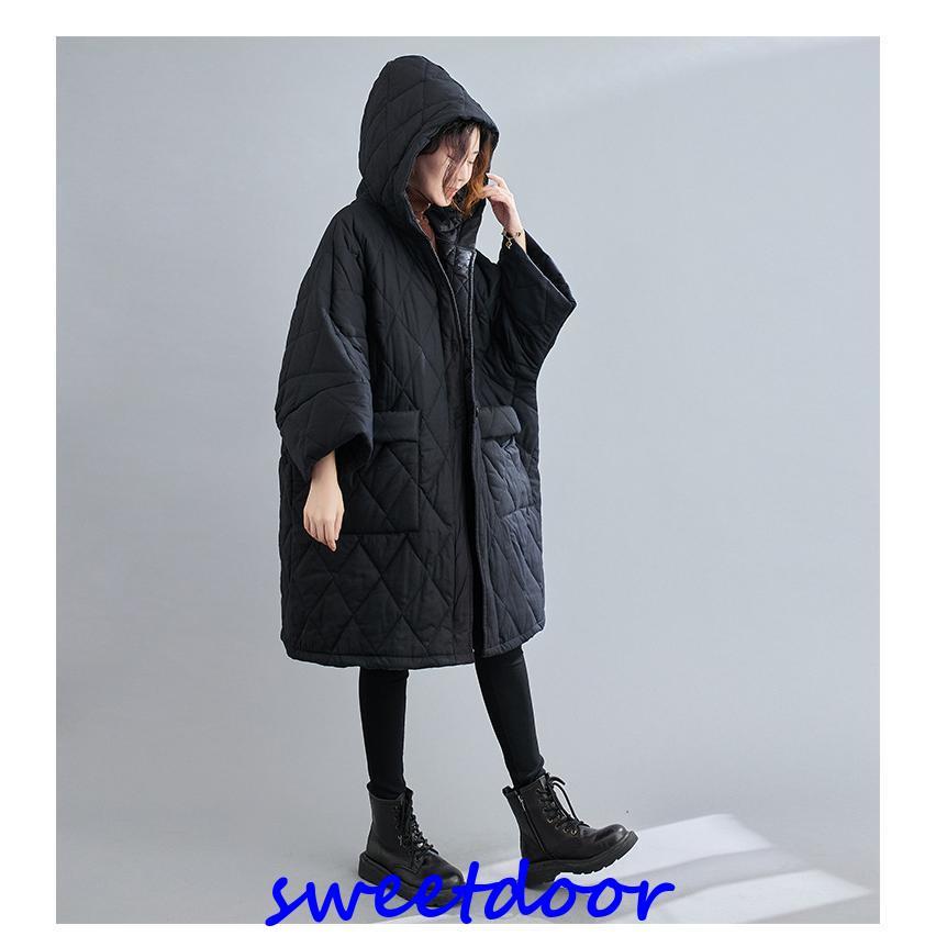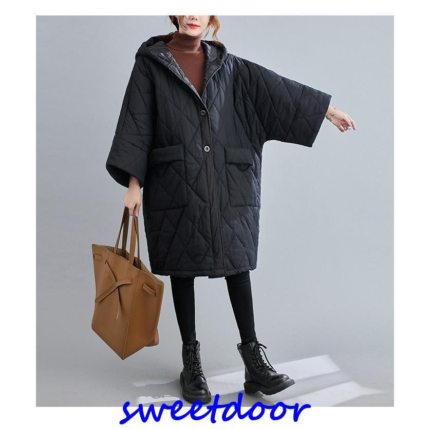 中綿コート コート レディース 冬 アウター ミディアム ロングコート 中綿 ゆったり 暖かい 体型カバー 大きい 体型カバー 防寒 フード付き 黒 40代