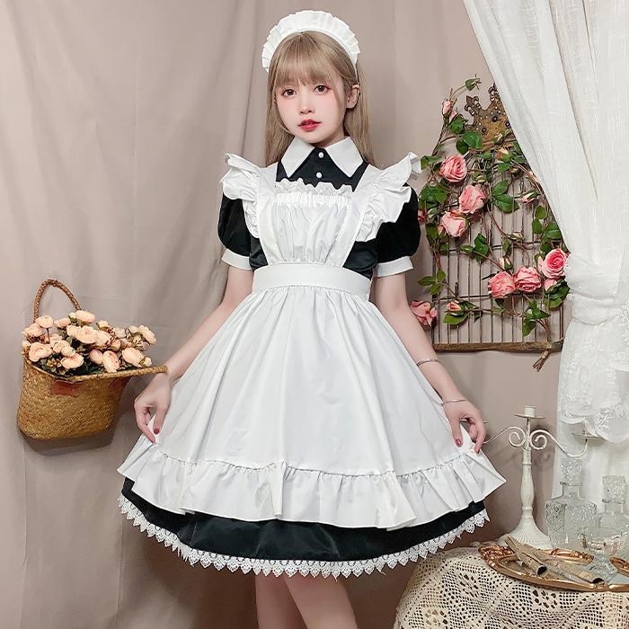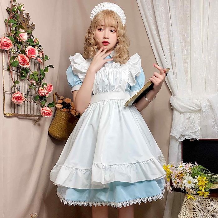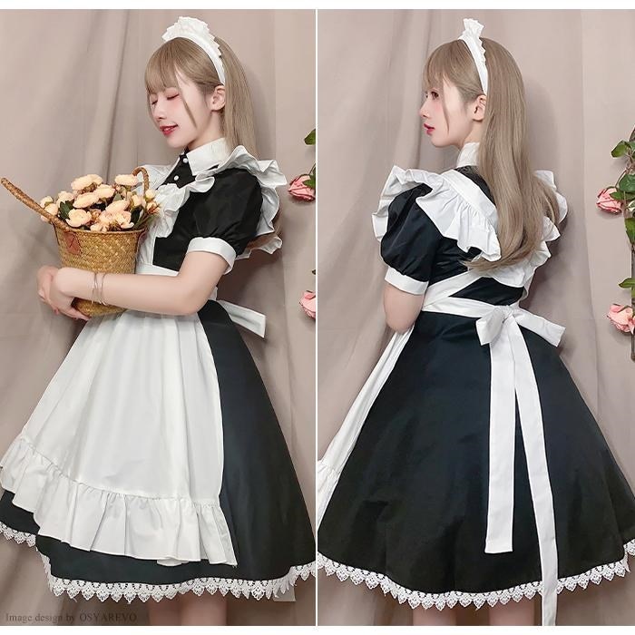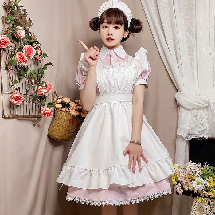 ハロウィン メイド服 コスプレ ワンピース エプロン ピンク ブルー ブラック 膝丈 ロング 半袖 ハロウィン