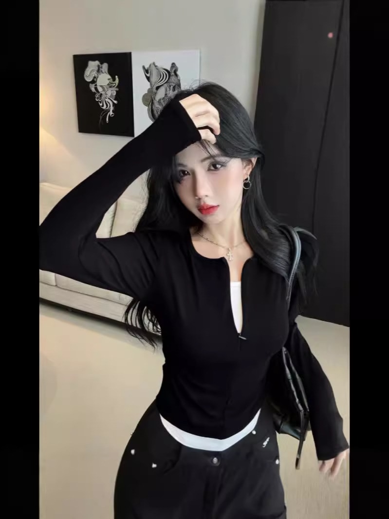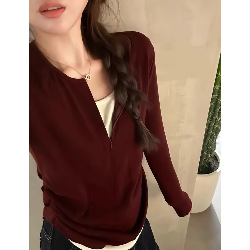 アンコールラレッド初秋の上着女性2024新型痩せ見えv襟Tシャツ気質修身正肩偽2枚の下着 Tシャツ カットソー