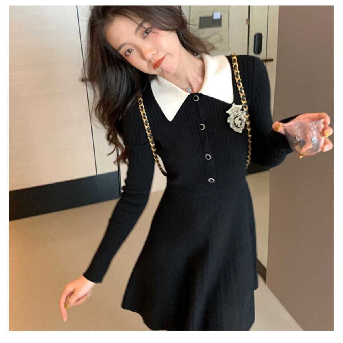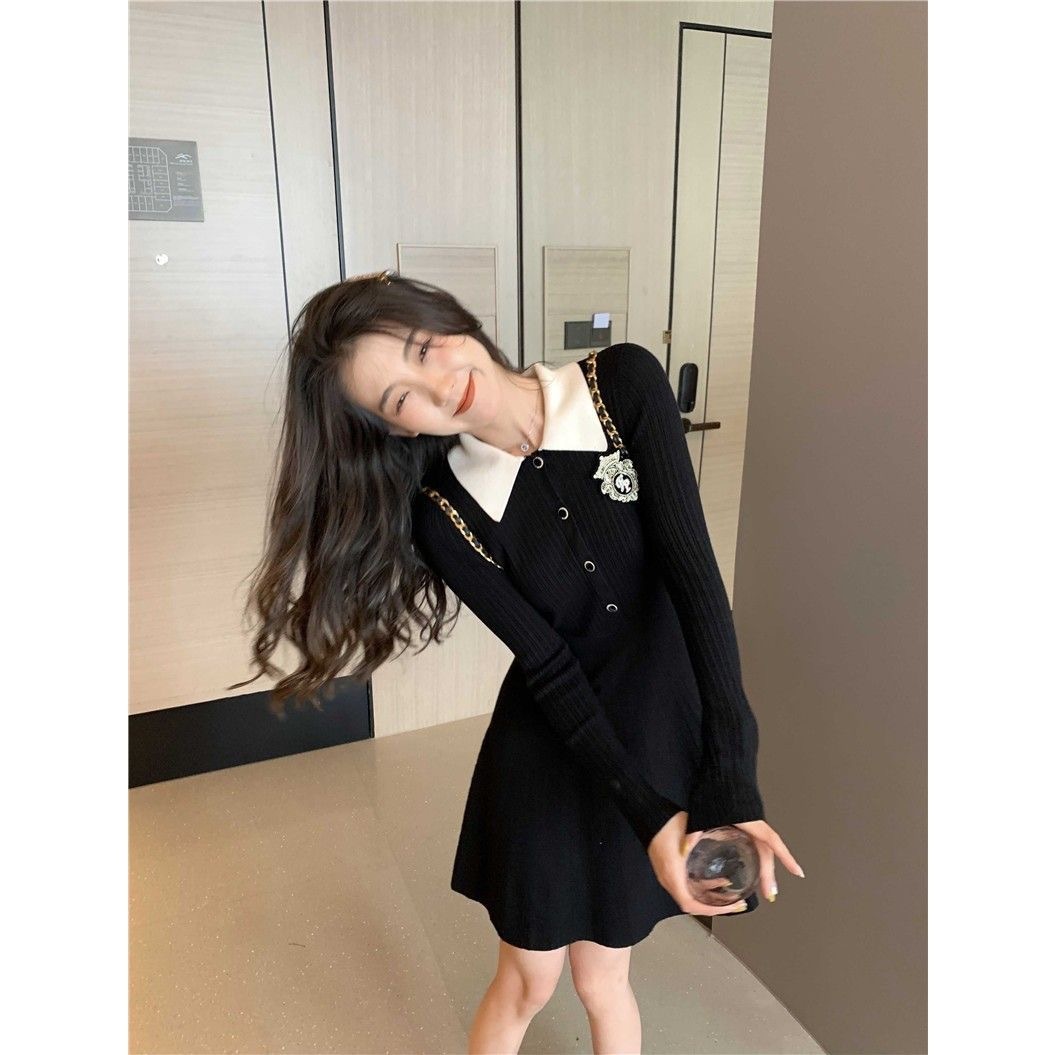 新作黒長袖ニットワンピース秋の小柄カレッジ風スレンダー着やせ気質スカート女装 長袖ロング マキシ丈ワンピ