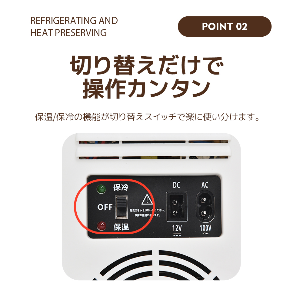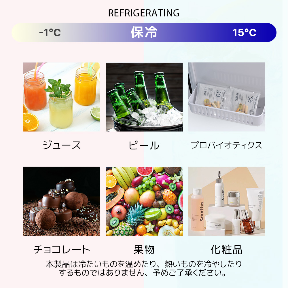 冷蔵飲料や果物などの食料品はもちろん、ビタミンやスキンケアを冷蔵したり、牛乳や母乳・お弁当などの温めにも役立ちます。