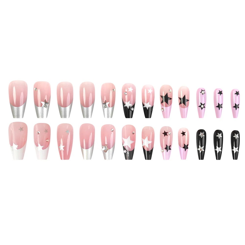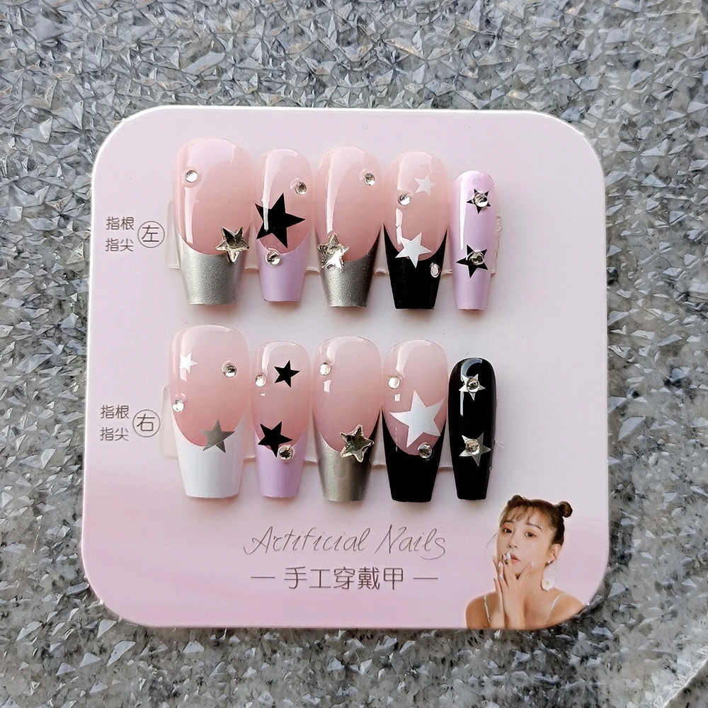 ライトセラピーハンドメイドネイルチップ ショート 24スターガラスラインストーン ジェルネイル 黒と白のフレンチスパイスネイルアート ネイルチップ