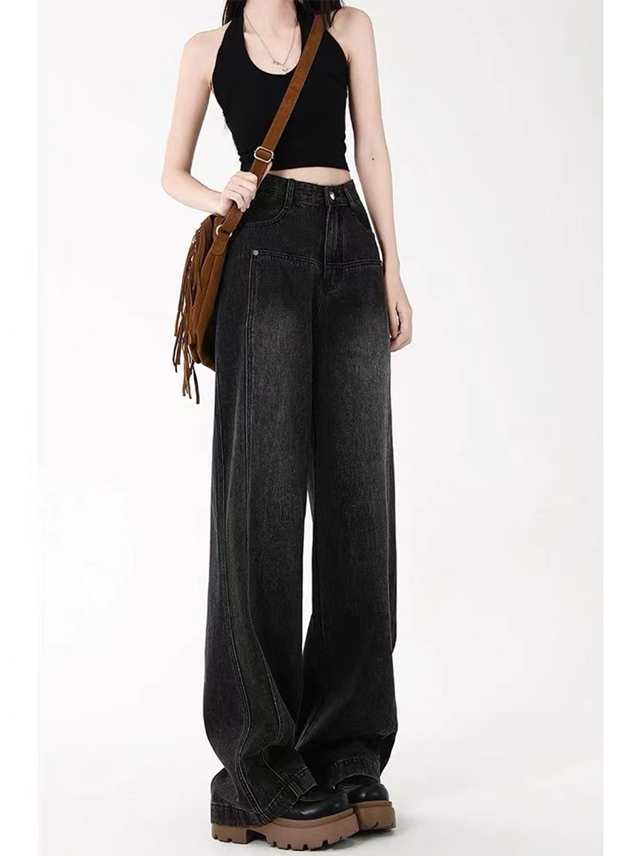 人气 新作 デニムパンツ ブラック ジーンズ レディース 春秋 ゆったり 薄手 ストレート ワイドパンツ モップパンツ デニム ジーンズ