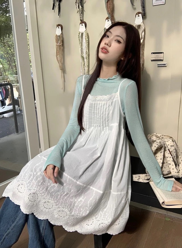 ヘビロテ キャミワンピース 膝丈 ジャンパースカート ジャンスカ ノースリーブ キャミソール Aライン レース 透かし彫り 白 ホワイト 春 韓国ファッション レディース おしゃれ かわいい ガーリ