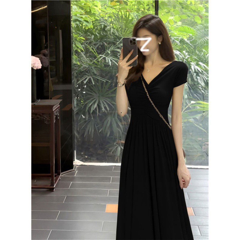 【2枚購入と2OO円OFF】無地で痩せて見えるロングワンピース夏ワンピース痩せ見え半袖雰囲気ロングドレス新型フィットフレンチウエスト裾スカート