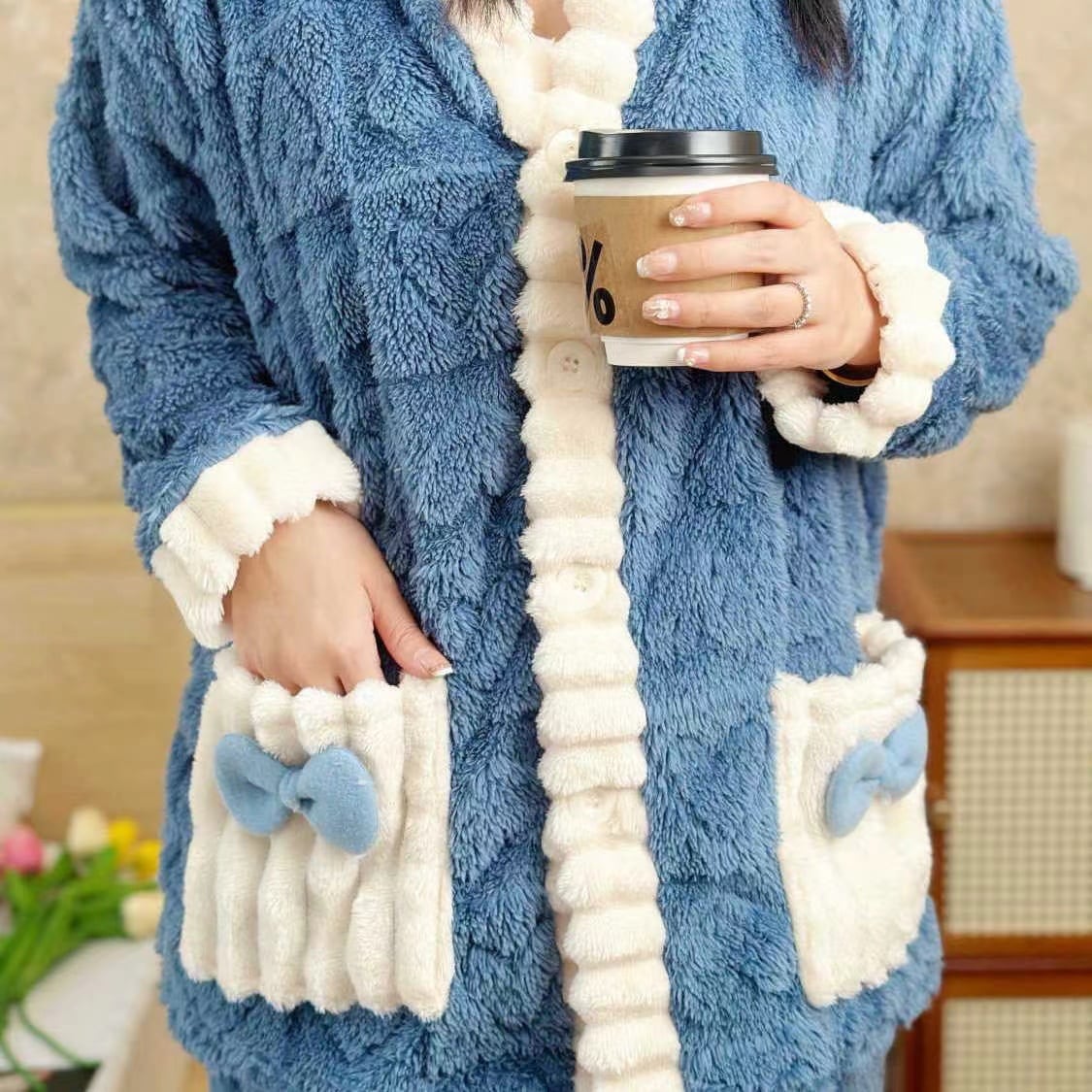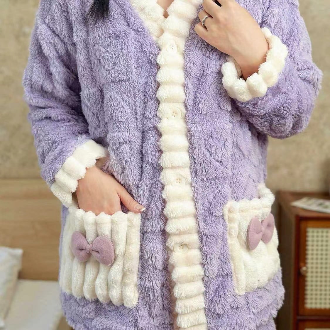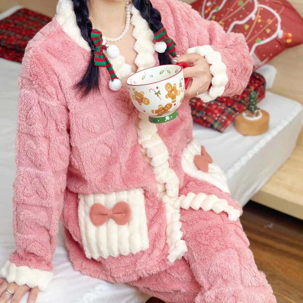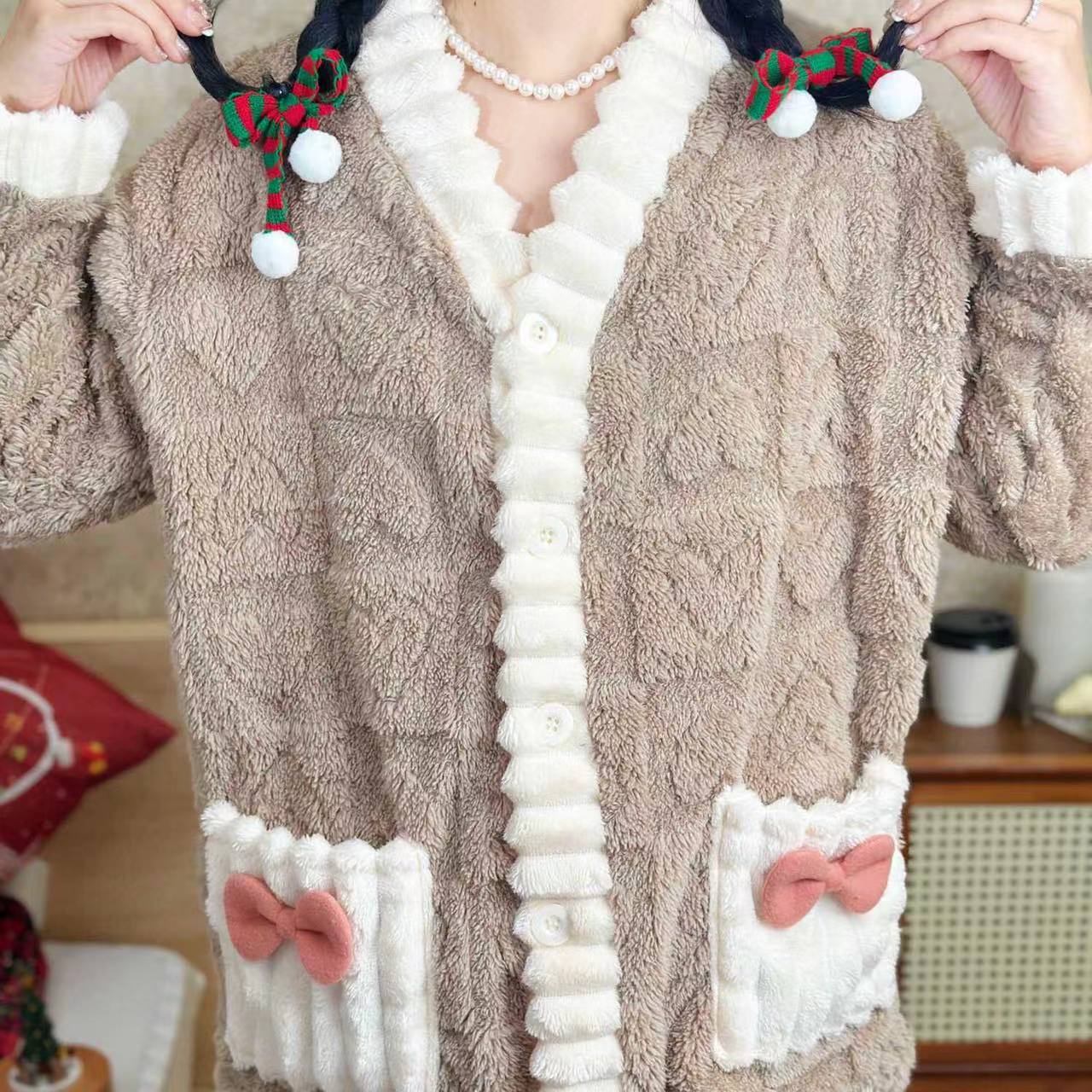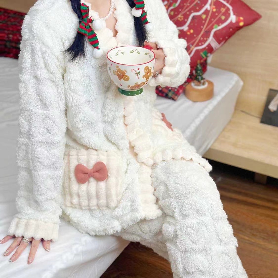 ティーン向けのキュートなポリエステルジャカードパジャマセット - Vネックニット生地リボンディテール暖かなコーラルフリースのバニー柄ラウンジウェアセット