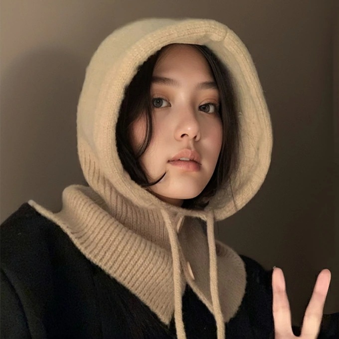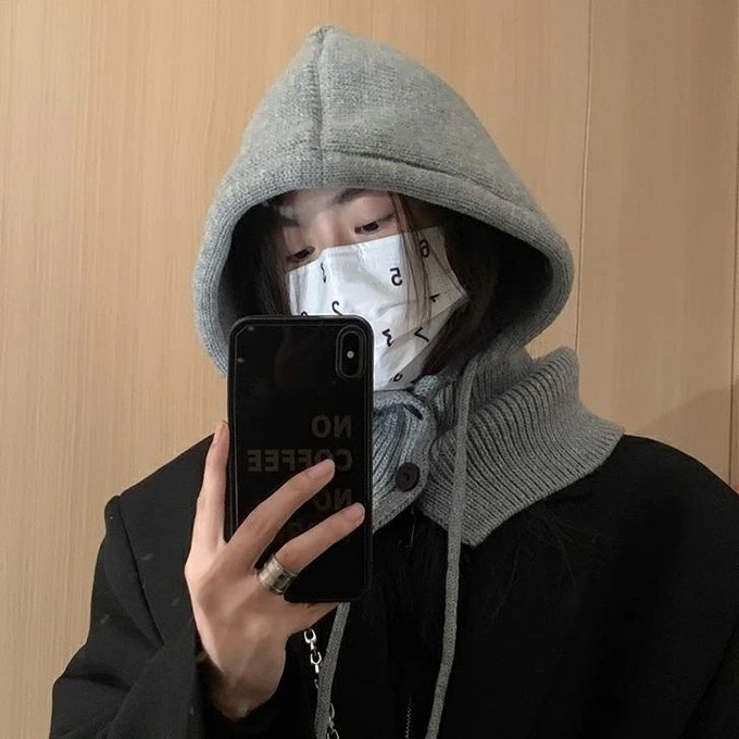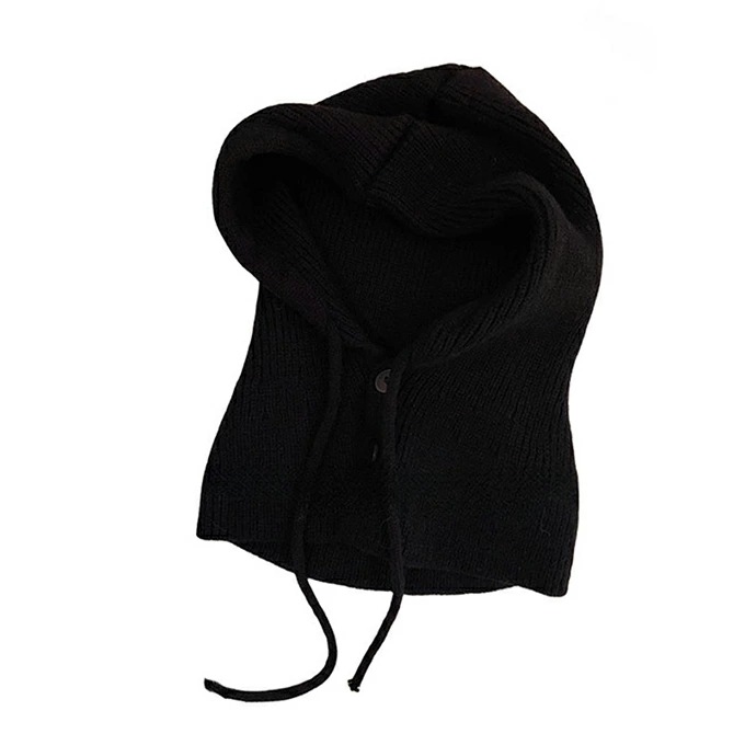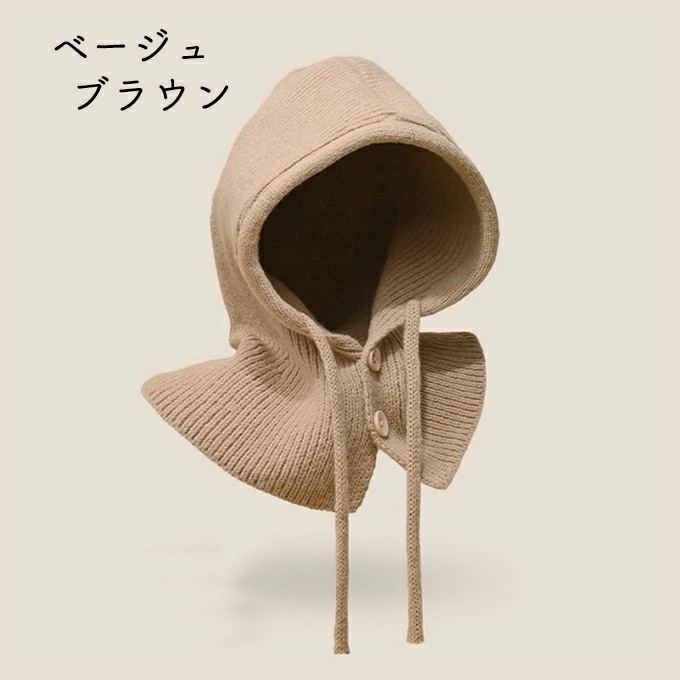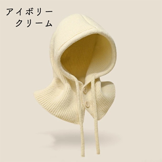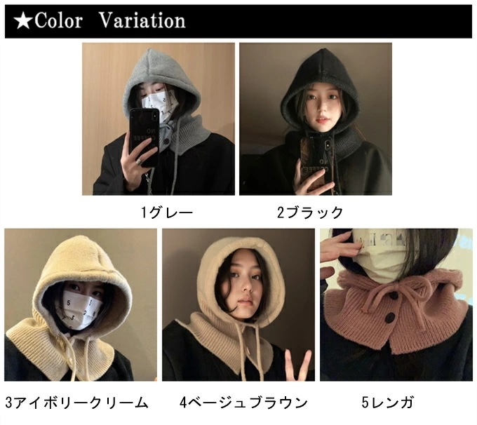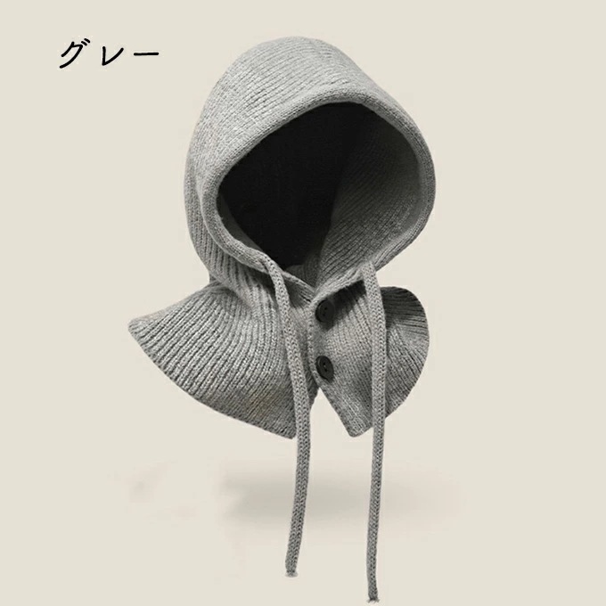 バラクラバ レディース 2way 冬 フードウォーマー ネックウォーマー あったか 帽子 マフラー 付けフード ニット 無地 防寒 フード 紐 ボタン 調節 スキー スノーボード グレー